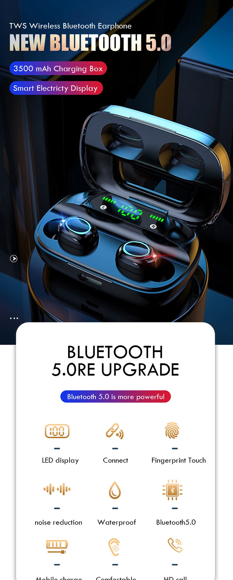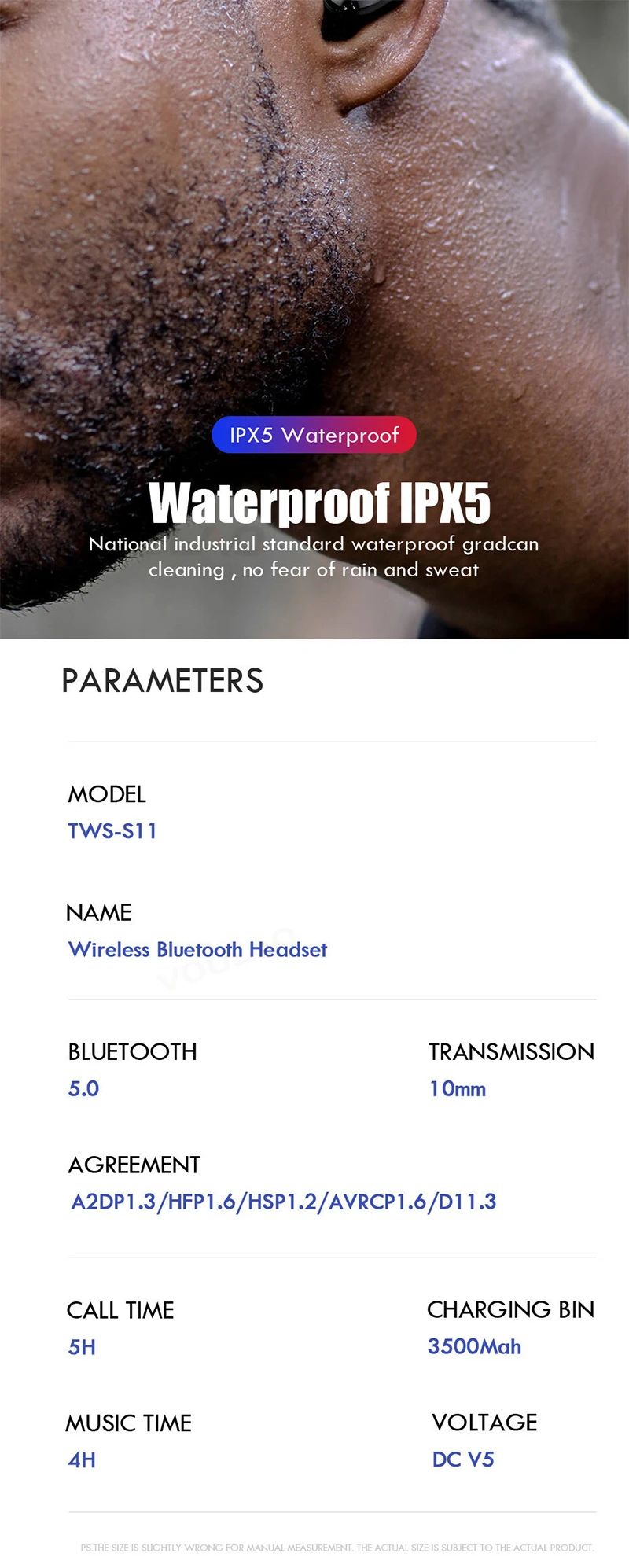 Название: беспроводные наушники TRER S11 TWS Цвет: черный, белый, серебристый беспроводные Bluetooth наушники Тип: Беспроводная bluetooth-гарнитура, беспроводные наушники, Bluetooth наушники Версия Bluetooth: Bluetooth V5.0 Особенность 1: bluetooth-наушники с функцией отпечатков пальцев, беспроводные наушники TWS Особенность 2: 3500 мАч Внешний аккумулятор, маленький и легкий Функция 1: беспроводные наушники TWS, беспроводные Bluetooth наушники Функция 2:audifonos inalambrico bluetooth, fone de ouvido bluetooth Совместимая модель 1: для iPhone Samsung Xiaomi Android Phone Время прослушивания музыки: 220-300 часов Прямая поставка/оптовая продажа: Поддержка