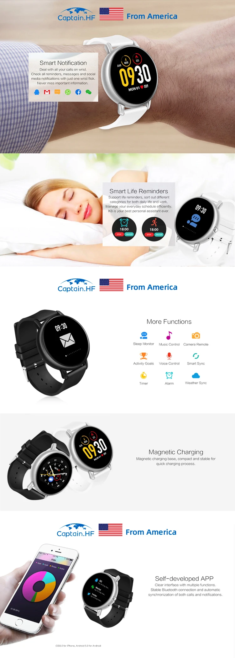 Тип: умные часы с Bluetooth Цвет изделия: черный, серебристый, серебристый, белый Дисплей: цветной экран ips 1,22 дюймов HD Разрешение: 240*208 Сенсорный экран: полный сенсорный экран Водонепроницаемый: IP67 Размер браслета: 44*11 мм Окружность ремешка: 16 см-20 см Вес браслета: 60 г Процессор: MT2502 Bluetooth: 4.0 + BLE Тип батареи: встроенный аккумулятор Емкость аккумулятора: 300 мАч Метод зарядки: Магнитная Зарядка Введение функции: пульс, bluetooth-звонки, сбор спортивных данных, мониторинг сна, с клиентским приложением, персонализированные настройки, синхронизированные спортивные данные, напоминание о звонках, будильник, секундомер, календарь, удаленная камера, найдите мобильный телефон, информацию, напоминание о сообщениях и т. Д. Размер упаковки: 101*81*71 мм Комплектация: часы x1, линия передачи данных x1, руководство пользователя x1, коробка x1