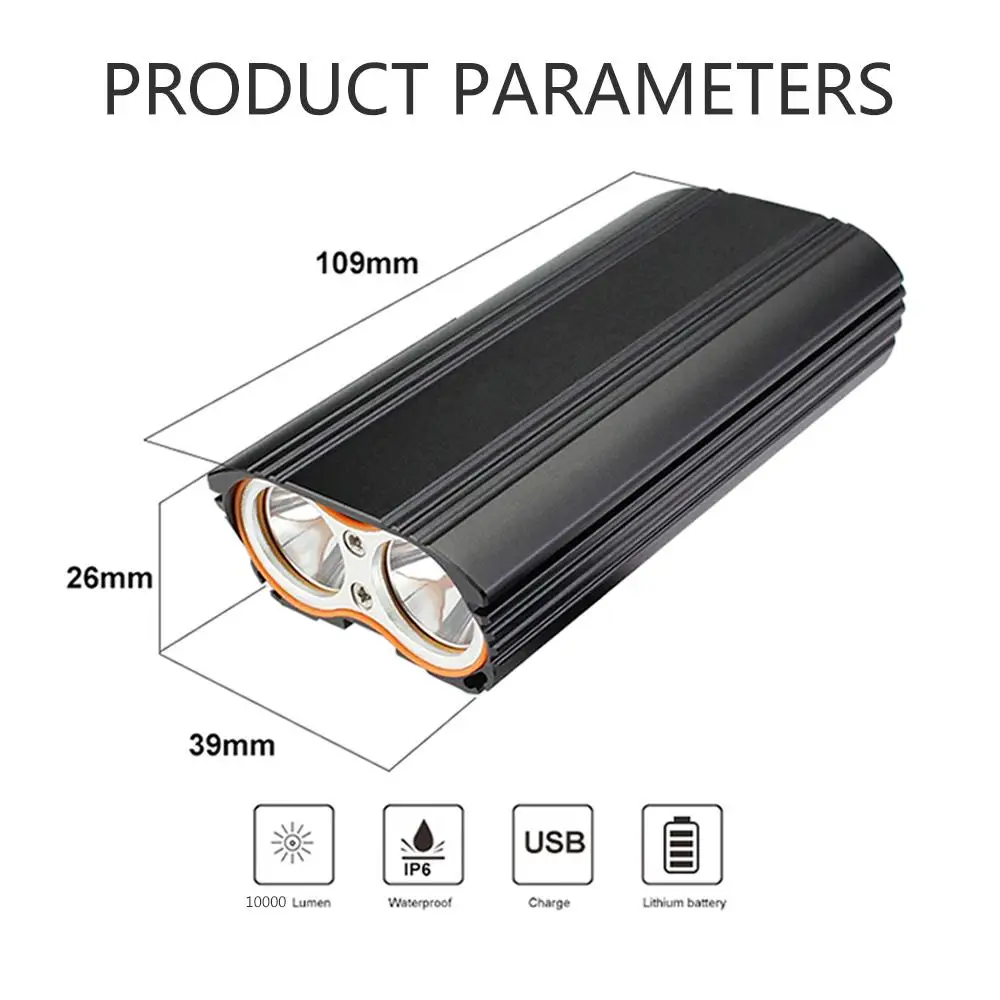 Продукт Параметры Возможны ошибки в измерениях вручную, пожалуйста, обратитесь к фактическим товарам. Название продукта: USB подсветка велосипедная фара Размер изделия: около 10,5*6*2 см Вес: около 244 г (только светильник); около 383 г (посылка) Яркость: Макс 10000 люмен Аккумулятор: 18650 встроенный аккумулятор * 2; Макс 6000 мАч Срок службы: сильный светильник около 4 часов Светильник из бисера: 2 * T6 лампы Водонепроницаемый: IP-65 Водонепроницаемый Радиус действия: около 200-300 м Материал: алюминиевый сплав Режимы: низкий/средний/подсветка/вспышка (Длительное нажатие) Фиксированный метод: два кронштейна для выбора Подходит для: ночной езды; наружного освещения