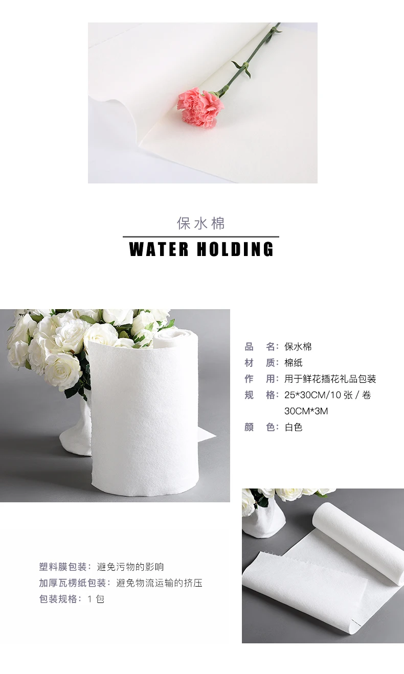 Импортные цветы, водостойкий хлопок, букет, увлажняющий хлопковый магазин упаковочных материалов, водосберегающий хлопок, абсорбирующий хлопок Название продукта: водонепроницаемый хлопок Материал: хлопковая бумага Размер: 25*30 см/10 листов/рулон 30 см * 3 м Цвет: белый Пластиковая пленка упаковка: чтобы избежать попадания грязи
