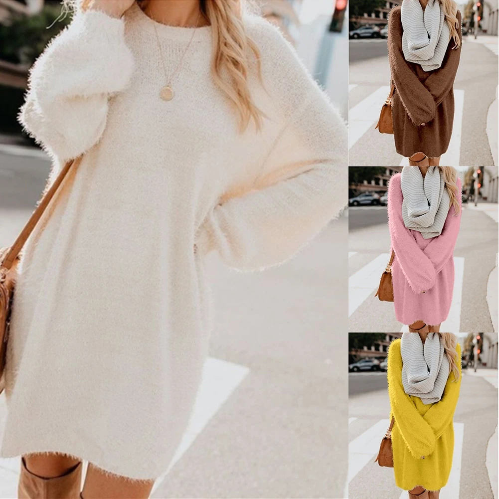 Шикарный женский осенний Однотонный свитер с круглым вырезом, пушистое свободное платье до колена