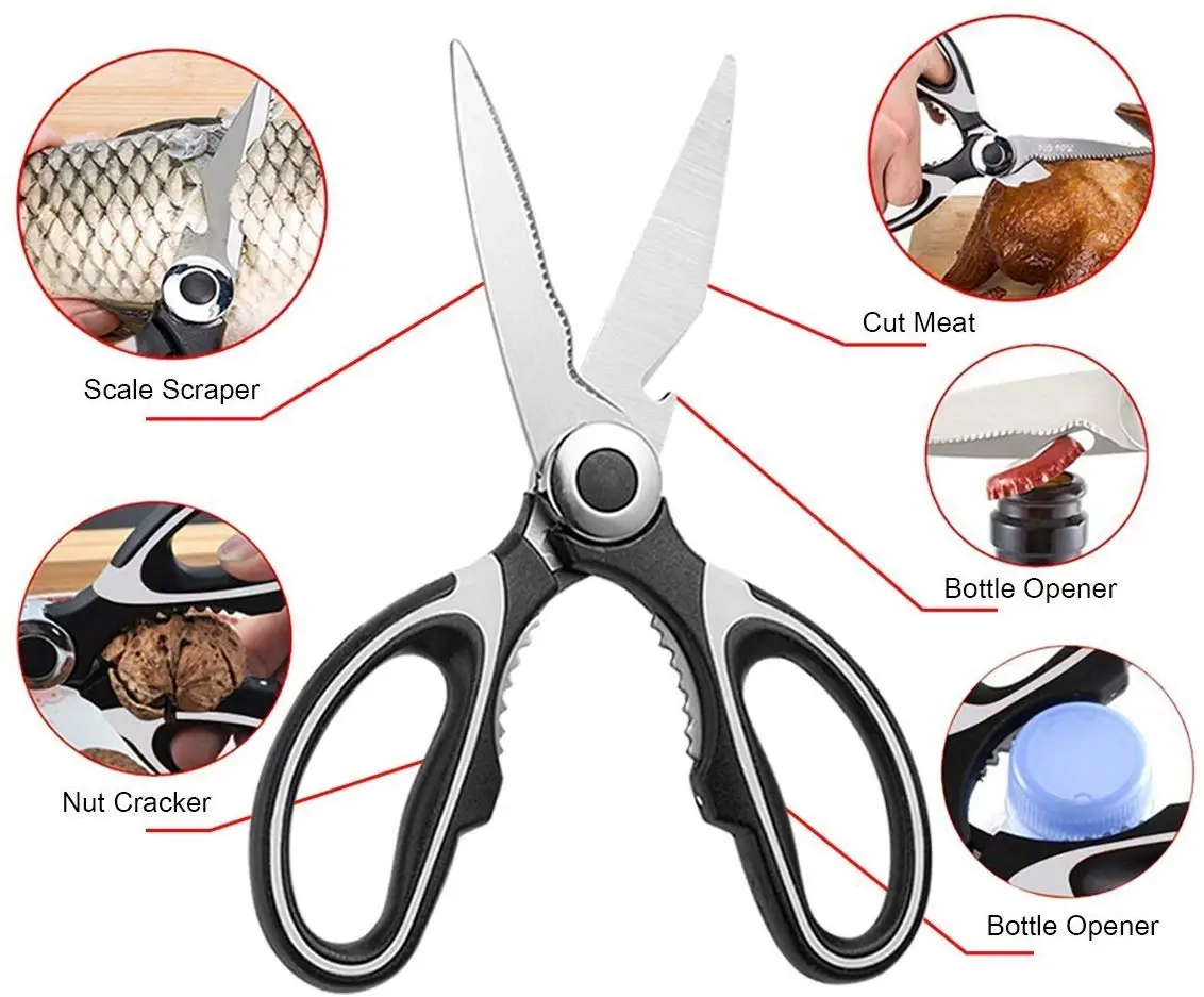 Прочный: Наши кухонные ножницы имеют лезвия из нержавеющей стали, которые устойчивы к ржавчине и безопасны для посудомоечной машины. Они зазубрены, чтобы сделать резку очень легкой и легкой!