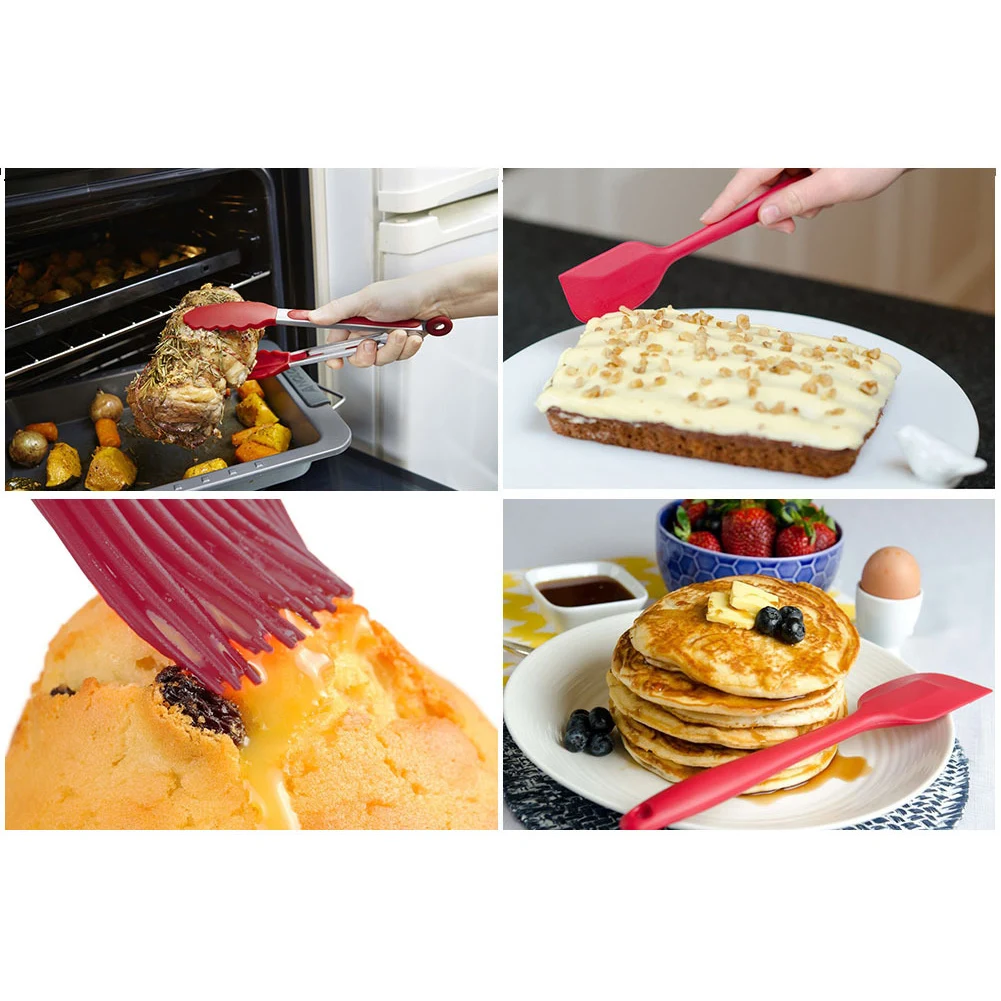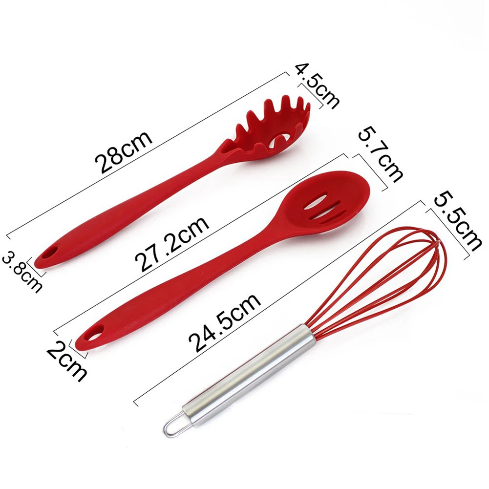 Этот набор из 10 кухонных принадлежностей включает в себя Тонг, венчик, щётку для выпечки, небольшой шпатель, большой шпатель, прорезную ложку, ложку, сервер для макаронных изделий, шлицевой Тернер и ковш. Это занимает температуру до 230 (446), выше, чем большинство обычных температур приготовления. Если у вас есть кастрюли с антипригарным покрытием, мы рекомендуем использовать этот набор. Они мягче, чем металл и мягче на внутренней стороне кастрюли.