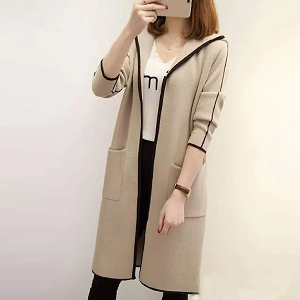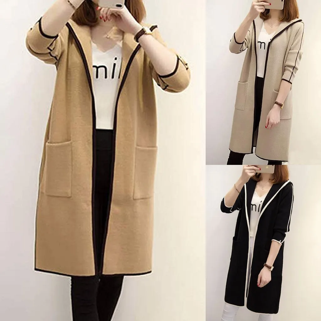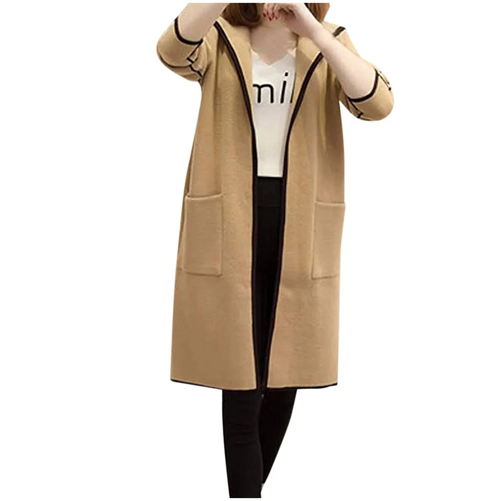 Женская Повседневная однотонная верхняя одежда с карманами, кардиган, пальто с капюшоном и длинными рукавами