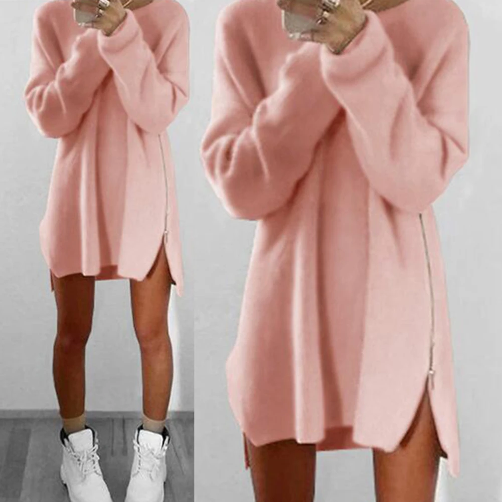 Women Sexy Solid Color Long Sleeve O Neck Sideway Zip Loose Mini Sweater Dress