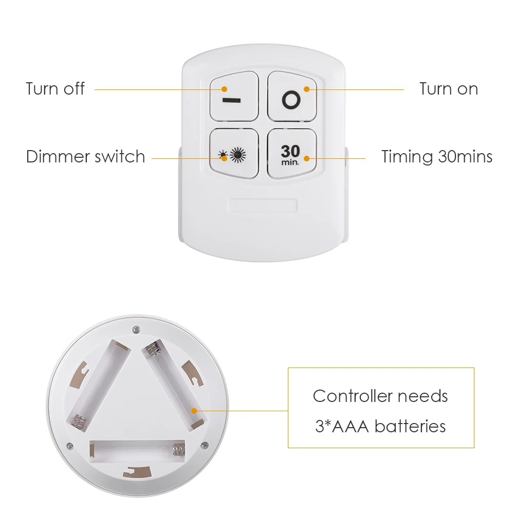 【Timer】: With the timer presets, you can set the puck light to turn off in 30 minutes. You can also use the remote control to dim the light.
