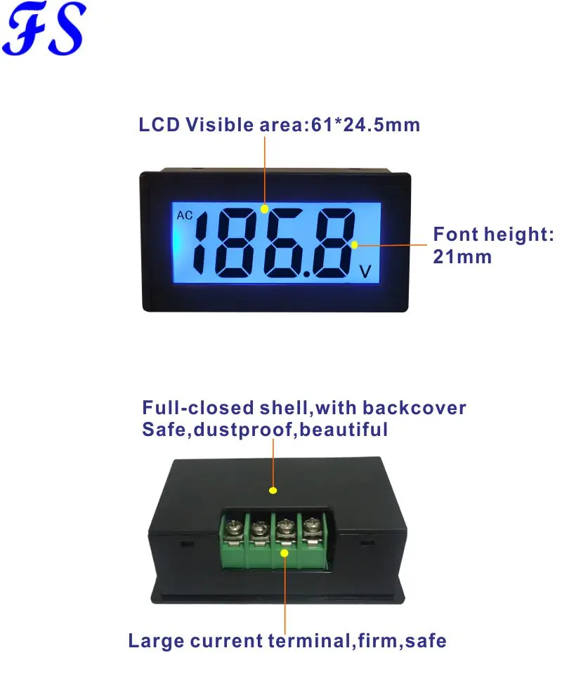 Мощность питания:AC100-240V Потребляемая мощность: <0,5 Вт Тесты напряжение: 200 мВ/2 В/20 В/500 В/1000 в/в Размер: 79*43*25 мм Монтажное отверстие: 76*39,5 мм Режим дисплея: ЖК-дисплей с синей подсветкой Точность измерения: 0.5% (± 2 цифры) Скорость измерения: ≥ 2 раза/с