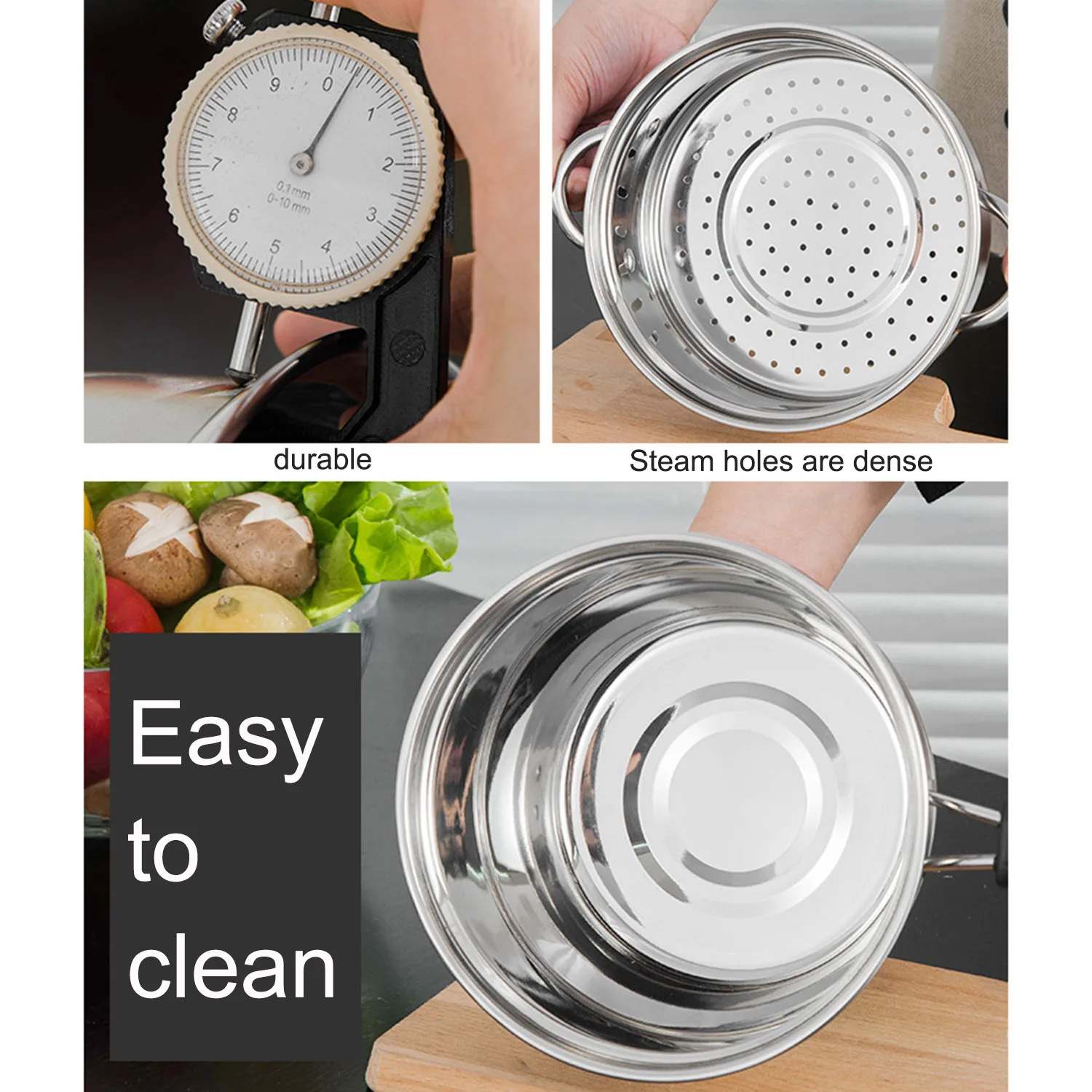 Пароварка из нержавеющей стали, что делает ее чрезвычайно прочной. Он подходит для любой плиты, включая индукцию, печь, газовую печь и топовые плиты.