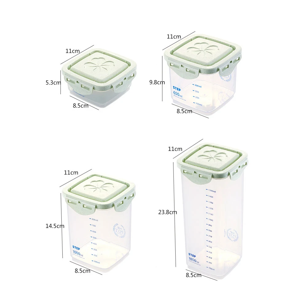 Размеры: 240 мл 11x8,5x5,3 см, 650 мл 11x8,5x9,8 см, 1000 мл 11x8,5x14,5 см, 1800 мл 11x8,5x23,5 см