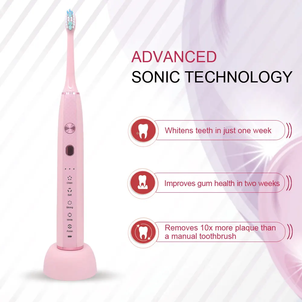 1. Модный дизайн и маленький размер 2. Класс водонепроницаемости IPX7 3. Пять режимов очистки, включая чистоту/мягкость/растяжение/белый/полировка, три слоя интенсивности в каждом режиме 4. Частота вибрации 31000 раз/мин 5. Два интеллектуальных автотаймера miniutes, 30 указателей интервала таймера 6. 800 мА/ч, батарея, 3,7 V, 1,8 W 7. USB Беспроводная Зарядная база, время зарядки около 4 часов, полная зарядка может использоваться 30 дней