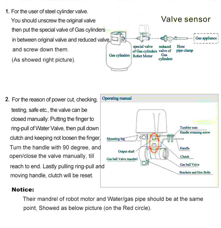 Особенности: Изготовлено специально для работы с газовой сигнализацией. Применяется для автоматического контроля других газовых или жидких клапанов. Три трехмерные регулируемые кронштейны и большой крутящий момент позволяют манипулятору адаптироваться к новым или старым газовым шаровым клапанам разных размеров. Предохранительное напряжение с изоляцией, уплотнением и огнестойкостью, анти-электромагнитными помехами и без искры. Идеальный элемент безопасности для вашей кухни и ванной комнаты. Описание: Оснащен специальным шаровым клапаном для автоматического управления газом в бутылках. Абсолютная безопасность и удобство использования, простота установки. Компактная конструкция и приятный внешний вид.