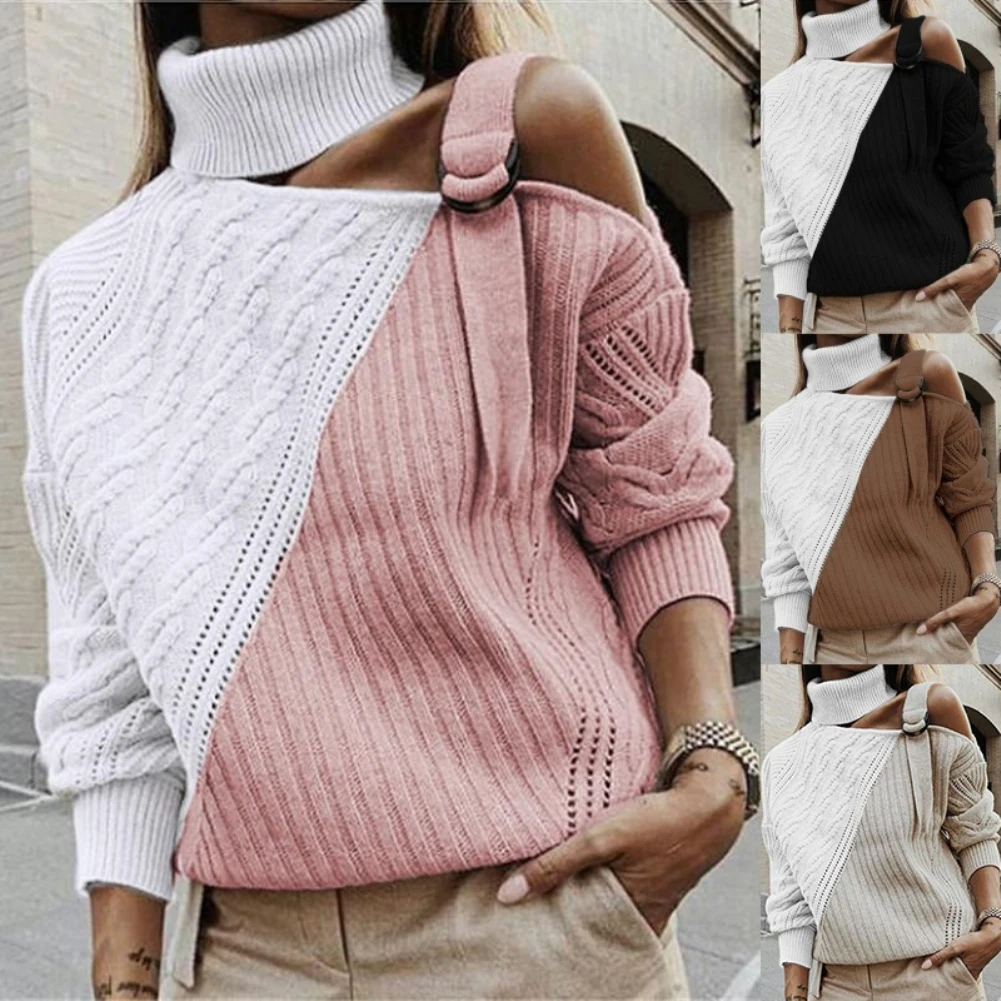 Women Color Block Turtle Neck Adjustable Strap One Shoulder Knitted Sweater