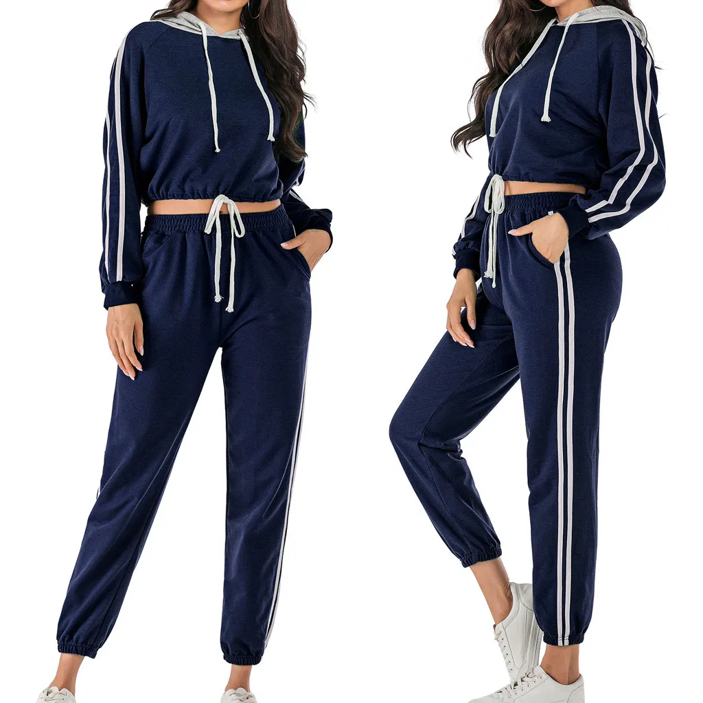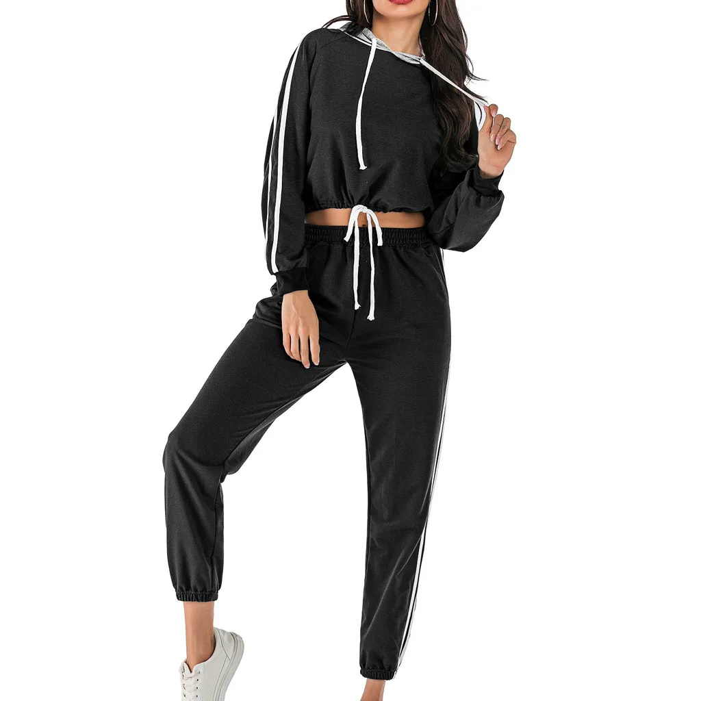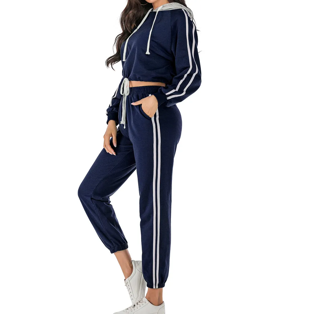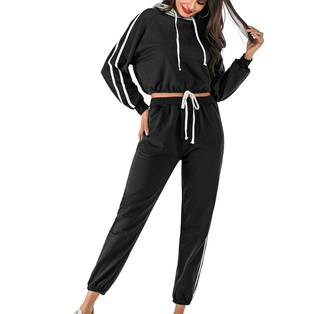 Комплект из 2 предметов: женский короткий свитер с длинным рукавом и капюшоном в полоску и брюки