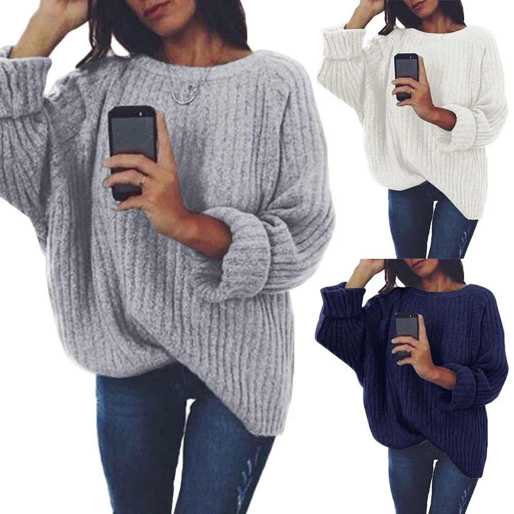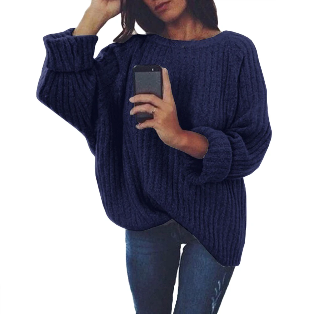 Casual Women Autumn O Neck Long Sleeve Solid Color Pullover Knitted Sweater