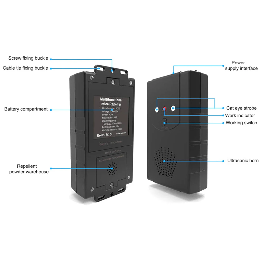 -Излучает сочетание ультразвуковых и светодиодный фонарей, чтобы отпугивать надоедливых животных, попадающих в ваш автомобиль.