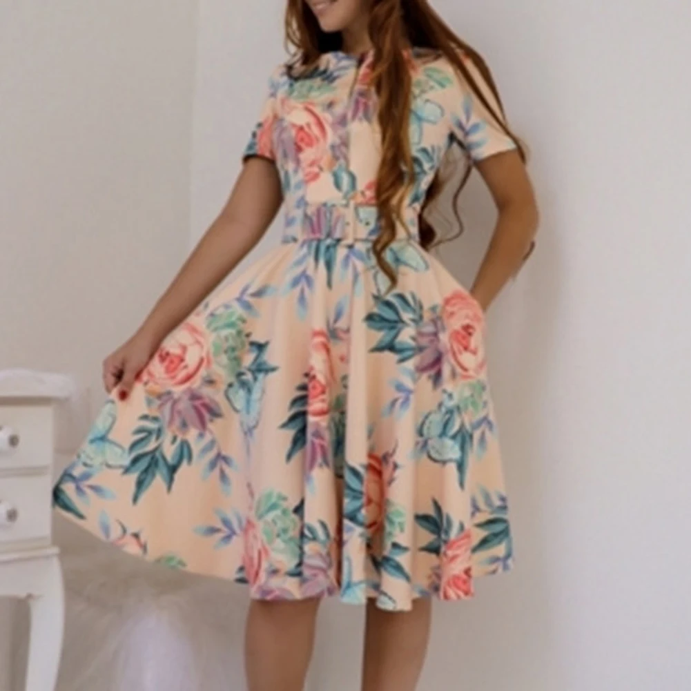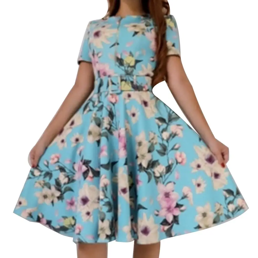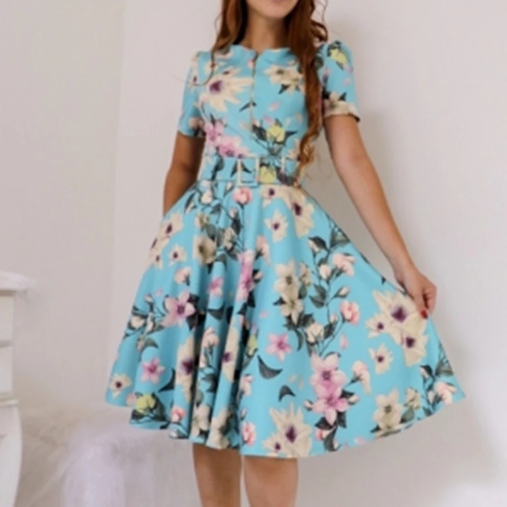 2019 модное летнее винтажное женское платье с цветочным принтом, короткий рукав, а-силуэт, на молнии спереди, с поясом, Пляжное вечернее платье миди