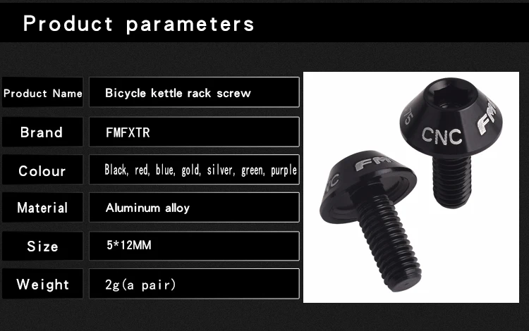 Название продукта: винт для велосипедного чайника Бренд: fmfxtr Цвет: черный, красный, синий, золотой, серебряный, зеленый, фиолетовый Материал: алюминиевый сплав Размер: 5*12 мм Вес: 2 г (пара)