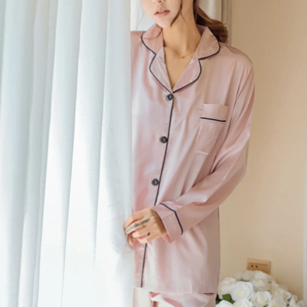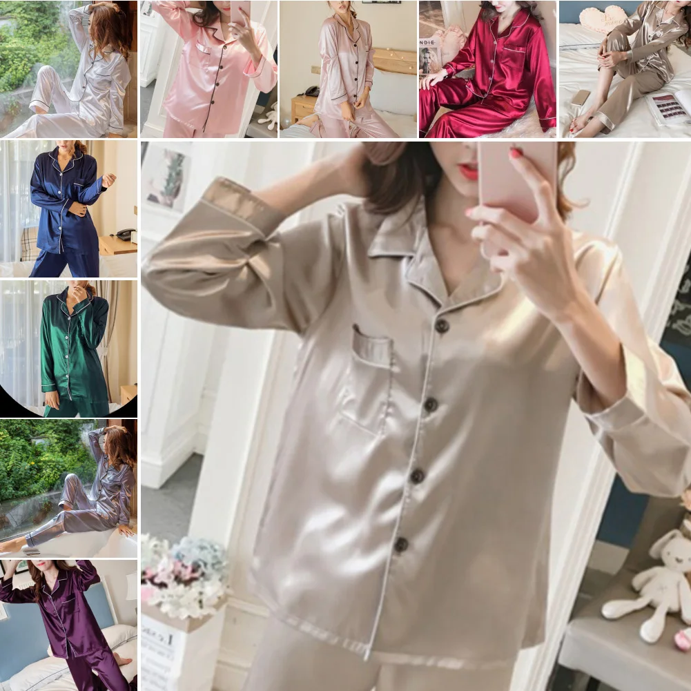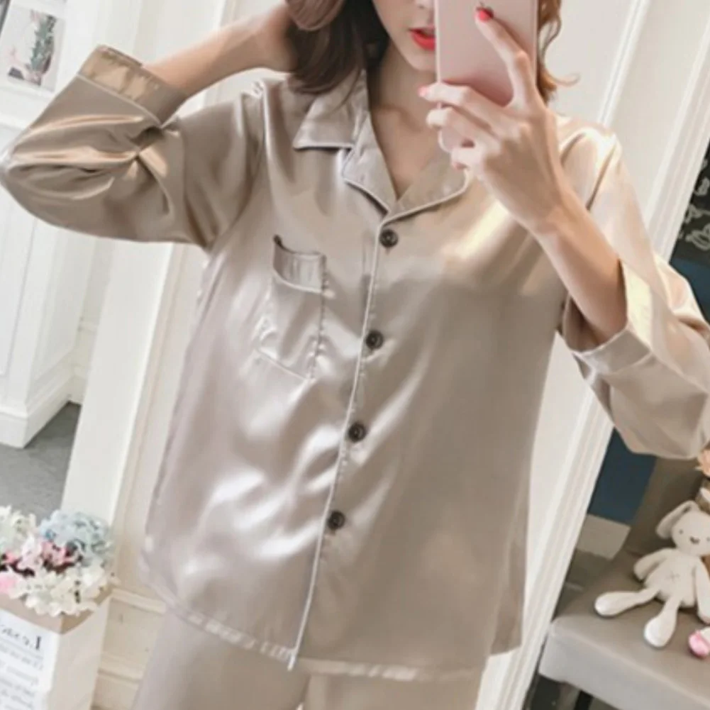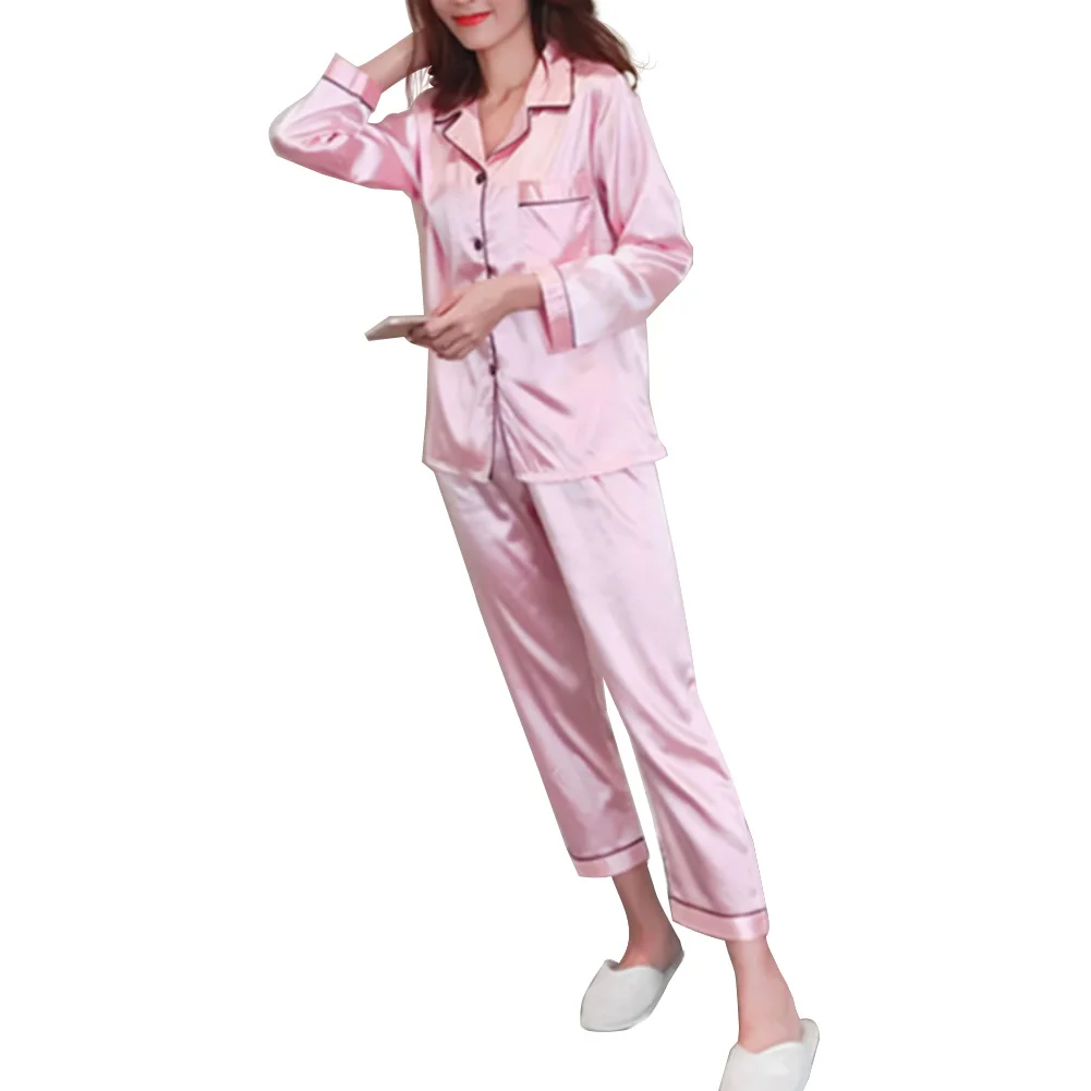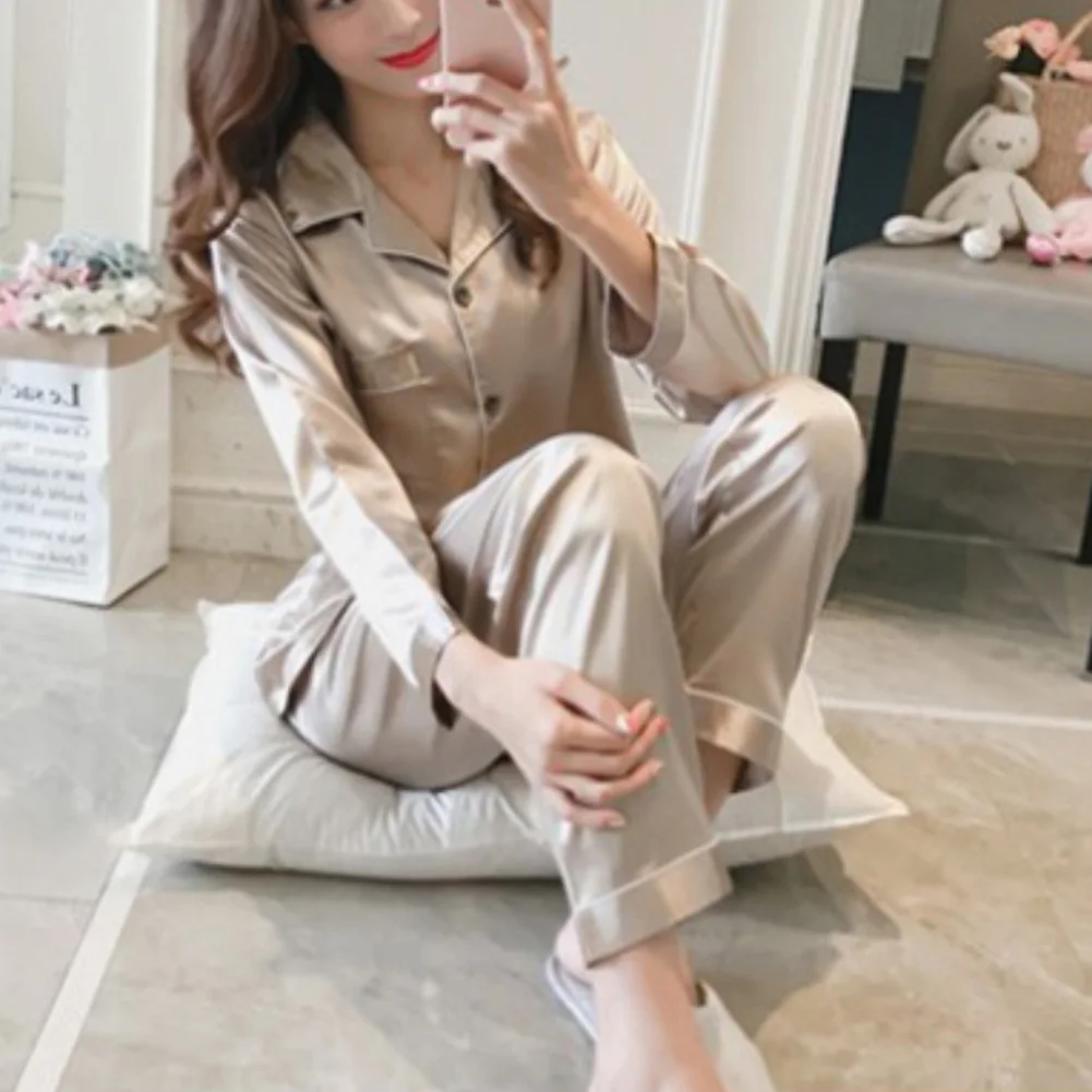 Женский пижамный комплект из 2 предметов, осенняя Однотонная рубашка с длинными рукавами и штаны из искусственного шелка