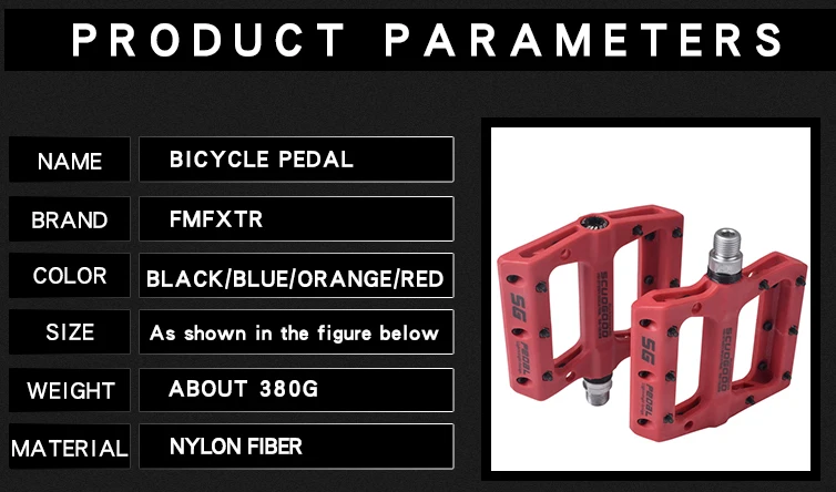 Название: велосипедная педаль Бренд: fmfxtr Цвет: черный, синий, оранжевый, красный Размер: как показано на рисунке ниже Вес: около 380 г Материал: нейлоновое волокно