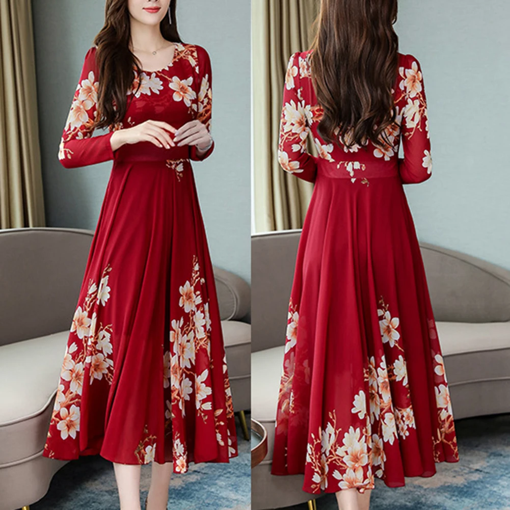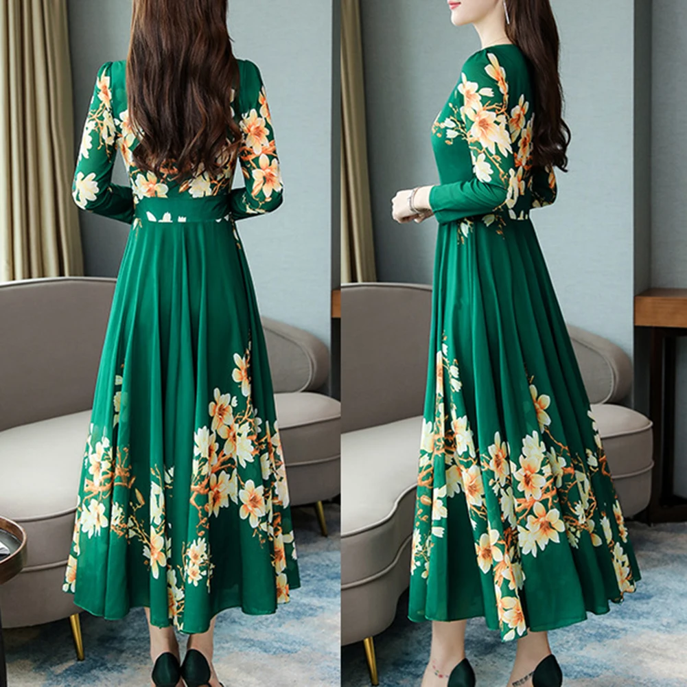 Размера плюс Для женщин элегантное платье с длинными рукавами и круглым вырезом Цветочный принт развевающиеся широкие женские платья