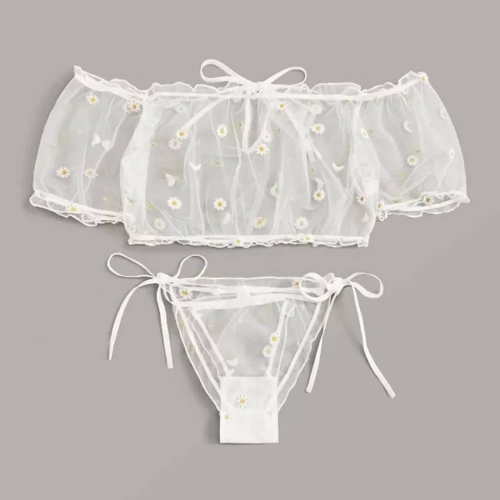 Новинка, женское кружевное белье без бретелек, с вышивкой и бантом, без косточек, Сексуальное цветочное нижнее белье, стринги, ночное белье, женские пижамы, нижнее белье