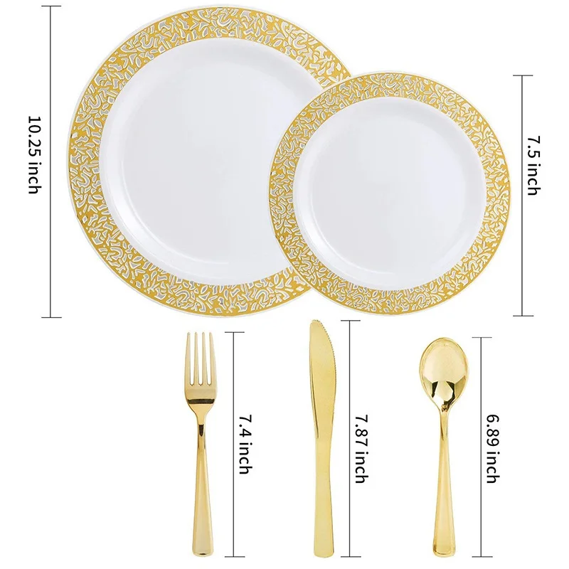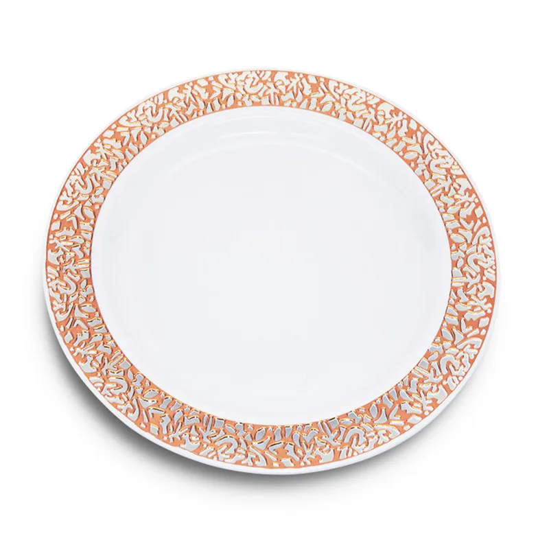 Золотые одноразовые пластиковые блюда, кружева, дизайн, свадебные тарелки, розовое золото, посуда, фруктовое блюдце, пищевое блюдо, кухонные принадлежности25 шт 7,5 дюйма 10,25 дюйма