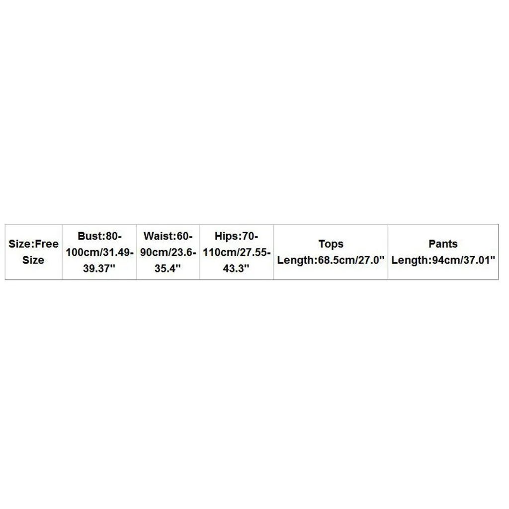 Size Bust Waist Hip Tops Length Pants Length Free Size 80-100cm/31.50-39.37'' 60-90cm/23.62-35.43'' 60-90cm/23.62-35.43'' 55-66cm/21.65-25.98'' 94cm/37.01''