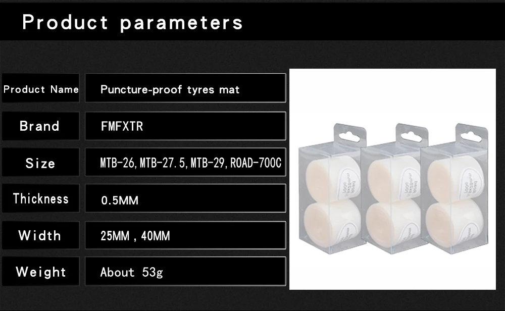 Название продукта: коврик для защиты от проколов и шин Бренд: fmfxtr Размеры: MTB-26,MTB-27.5,MTB-29,ROAD-700C Толщина: 05 мм Ширина: 25 мм, 40 мм Вес: около 53 г