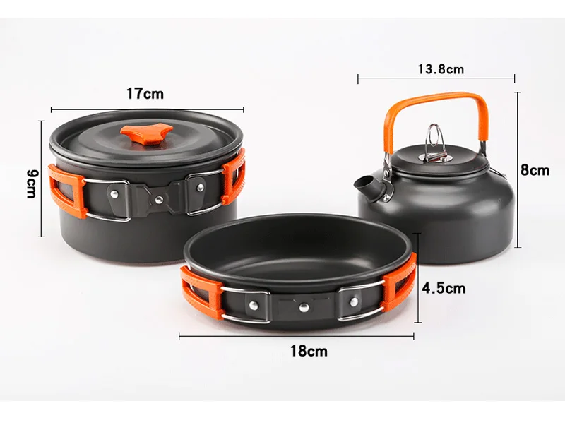 Product Feature: Made of imported aluminum, high-grade hard aluminum oxidation, high temperature resistance, abrasion resistance and comfortable hand feeling. It should be used indoors and outdoors. Product includes: 1×Cooking pot 1×Frying pan 1×Kettle 1×Knife 1×Fork 1×Spoon 1×Carry bags