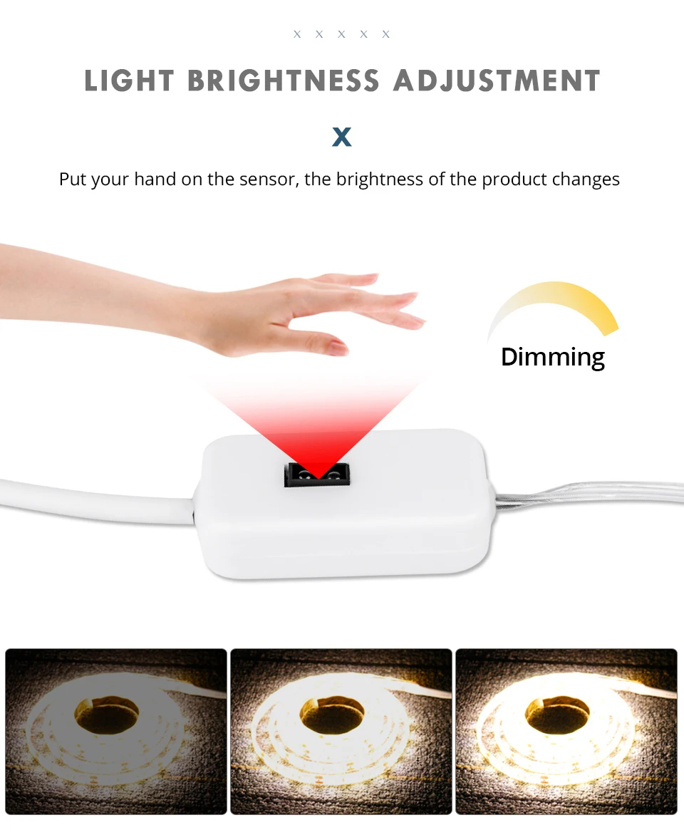 Особенности: 1. Этот светильник с сенсорным переключателем для рук-это идеальное решение для кухни, туалета, в тех местах, где вы не хотите трогать выключатель, когда ваши руки влажные, просто пришлите руку на выключатель, чтобы активировать светильник (рабочее расстояние составляет 2-5 см), и снова Поверните, чтобы выключить. 2. Идеально подходит для спальни, кухни и шкафа, гардероба, шкафа, лестницы 3. Легкая и легкая установка: вы можете приклеить его куда угодно с помощью клейкой ленты или винтов. Параметры: Тип переключателя: ручной выключатель с регулируемой яркостью Цвет освещения: белый, теплый белый, RGB Цветовая температура: теплый белый (2800-3000K)/белый (6000K-6500K) Тип светодиодов: 2835SMD Длина: 1 м, 2 м, 3 м, 4 м, 5 м Напряжение: DC5V Адаптер питания: питание от USB Количество ламп: 60 светодиодов/м Водонепроницаемый индекс: IP33/ IP65 Расстояние обнаружения: 2-5 см Режим: Теплый белый/белый: Постоянный светильник, режим втулки, режим дыхания, затемнение RGB: Постоянный светильник, преобразование цвета, постепенная смена режима, затемнение