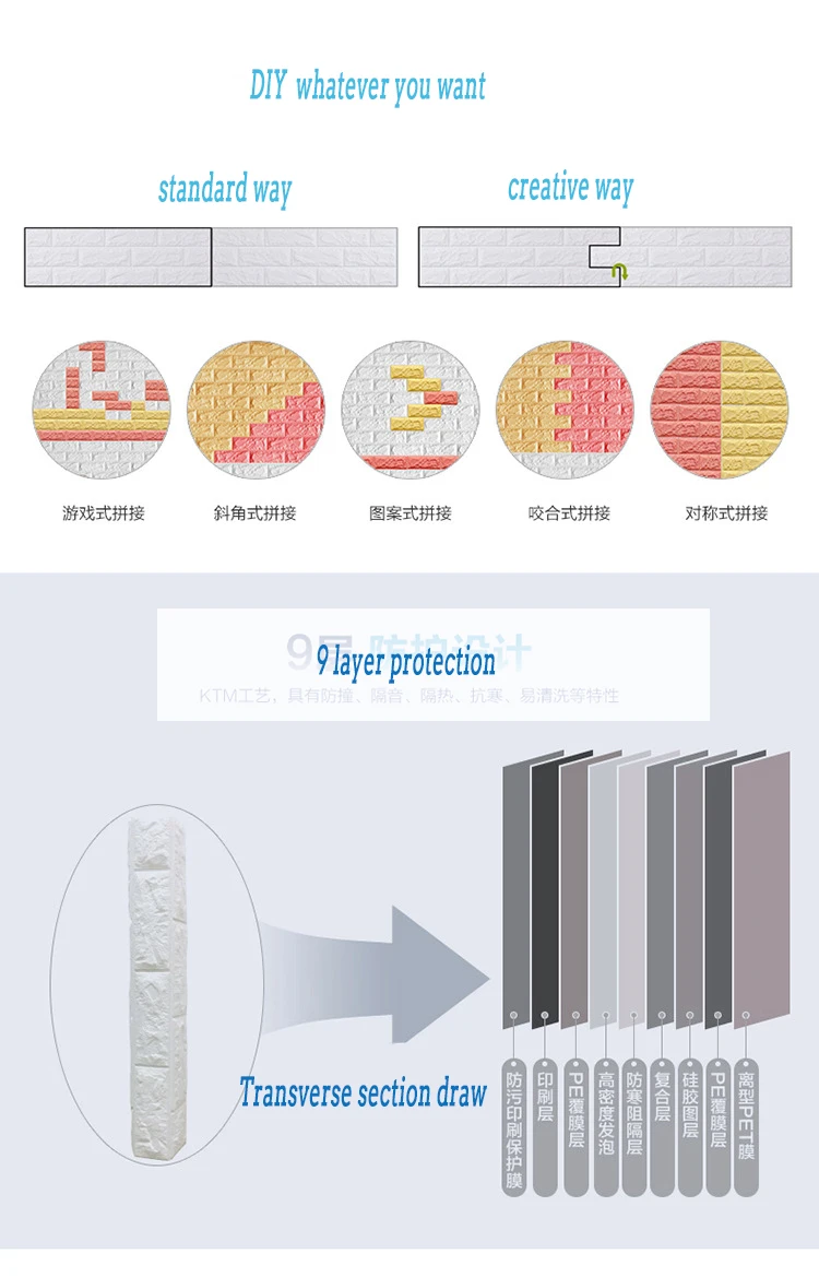 Material: XPe foam Product Size :70*77cm Per Piece . A piece of 0.53 square meters Wall sticker style: 3D wall stickers, the product comes with adhesive Feature: 1: Three-dimensional decorative soft foam, anti-collision for children, care for your family safe. 2: safety and environmental protection, non-toxic odor-free, suitable for family safe home space. 3: lifelike, natural brick pattern effect, simple and modern style. 4: Free DIY, easy self-adhesive design, installation, casual collage, arbitrarily cut. 5: Compared wallpaper better noise reduction effect. Installation methods and tools Preparation: Paste the surface clean with adhesion, such as: wood surface, glass surface, no dust wall, hit the bottom of the wall putty and so on. Paste: the back cover torn paper pasted to the auxiliary tools: scissors, utility knife Attention: Please buy enough piece at a time to make sure they are come from the same batch to avoid color difference. !!!About chromatic aberration problem: There will be a little color difference between the real object and the picture. The light is different, the angle is different, and the mobile phone or computer monitor will have a little influence.
