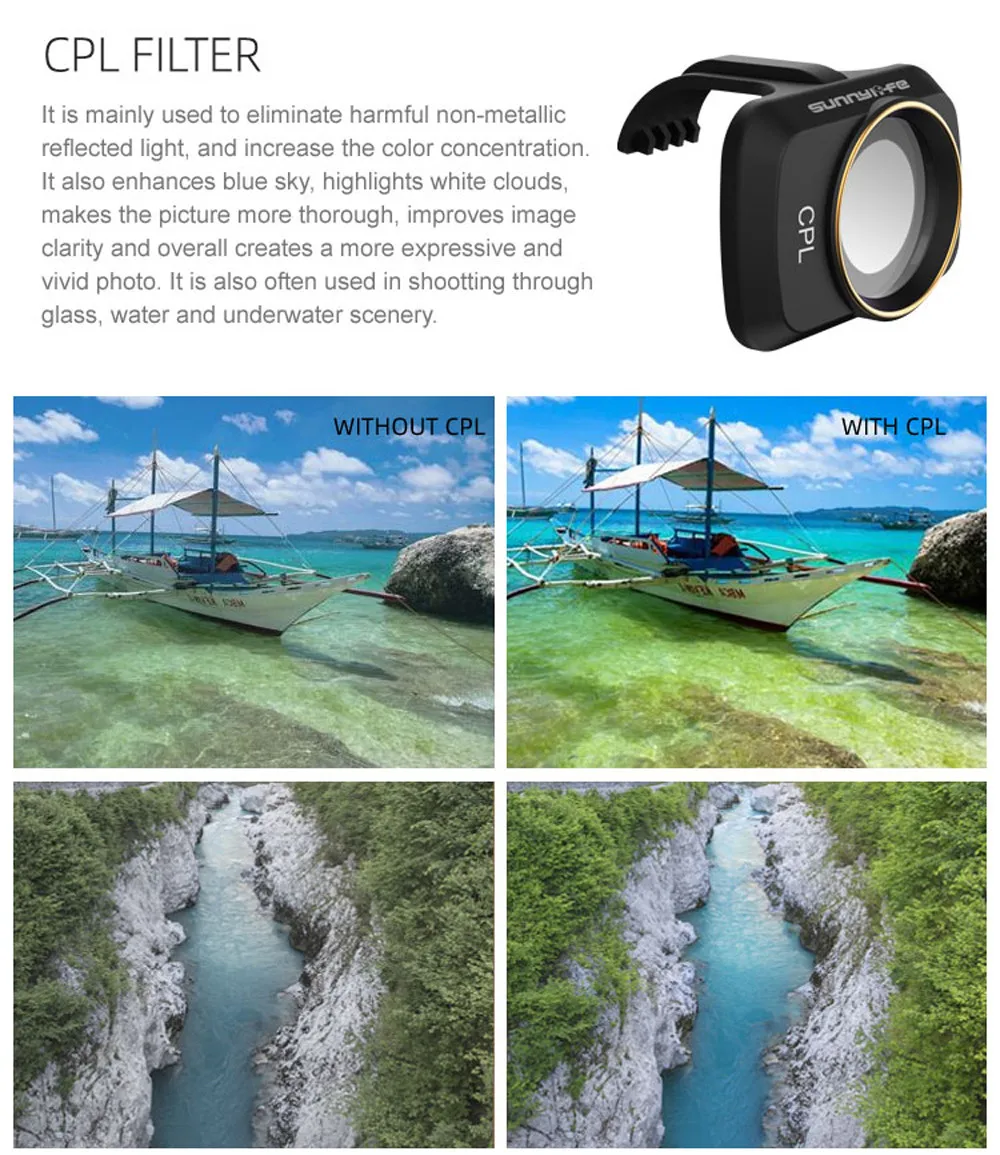 Легкий вес, каждый вес около 0,76-0,8 г, не повлияет на самоконтрольПрофессиональные оптические стеклянные линзы, специально подобранныеПрофессиональные оптические стеклянные линзы (импортированные из Германии) с превосходным процессом обработки, хорошими физическими и hcemical свойствами.Многослойная пленка для покрытия, высокая пропускаемость, четкое изображение, восстановление цвета.Водонепроницаемая, маслостойкая, устойчивая к царапинам, эффективно защищает мини-камеру MavicИнтегрированная моделирующая рама, без темного угла.Бронзовая оправа, великолепная и элегантная.Используется с оригинальной защитой карданного шарнира, непродуваемой и быстрой установкой, плотно прилегает и неразрушительное изображение.CPL фильтр: