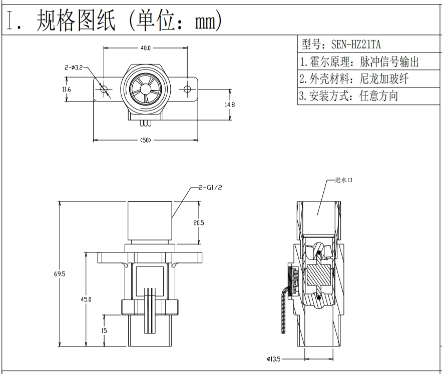 Датчик расхода воды SAIER изготовлен из высококачественного нейлона, состоит из корпуса из нейлонового пластика, водного ротора и датчика холла. Встроенный датчик Холла выводит соответствующий импульсный сигнал с каждым оборотом и герметично выводится из водопроводной трубы и позволяет датчику оставаться безопасным и сухим. Теория проста: Когда вода течет через ротор, ротор катится. Скорость меняется с разной скоростью потока. Датчик Холла выводит электрический импульс с каждым оборотом. Датчик очень прочный и долговечный в использовании, его Максимальное давление воды составляет 1,75 МПа. Легкий вес, компактный размер, стабильная производительность, начало низкого давления воды, простота установки и безопасность в использовании. Его можно идеально использовать для водонагревателей, диспенсеров для воды, водоочистителей, торговых автоматов для воды, кофемашин, устройств для измерения расхода, автоматов для контроля воды и так далее. Модель: SEN-HZ21TA Материал: нейлон + латунь Цвет: черный Подключение: G1/2 Диапазон расхода: 1 ~ 30 л/мин Спецификация: 69*50*27 мм Среда: Стандартная жидкость для питьевой воды Рабочее напряжение: DC4.5-18V Давление: 1,75 МПа Изолированный резистор: ≥ 100 Ом Спецификация линии и направление установки: Индивидуальные Ведущий способ: Красный в подключении анода Желтая Выходная линия сигнала Черный GND соединяет катод Посылка входит: Нейлоновый датчик расхода воды, 1 шт. Примечание: Если вам нужна более подробная информация, пожалуйста, свяжитесь с нашим торговым представителем. Мы будем очень рады помочь вам!