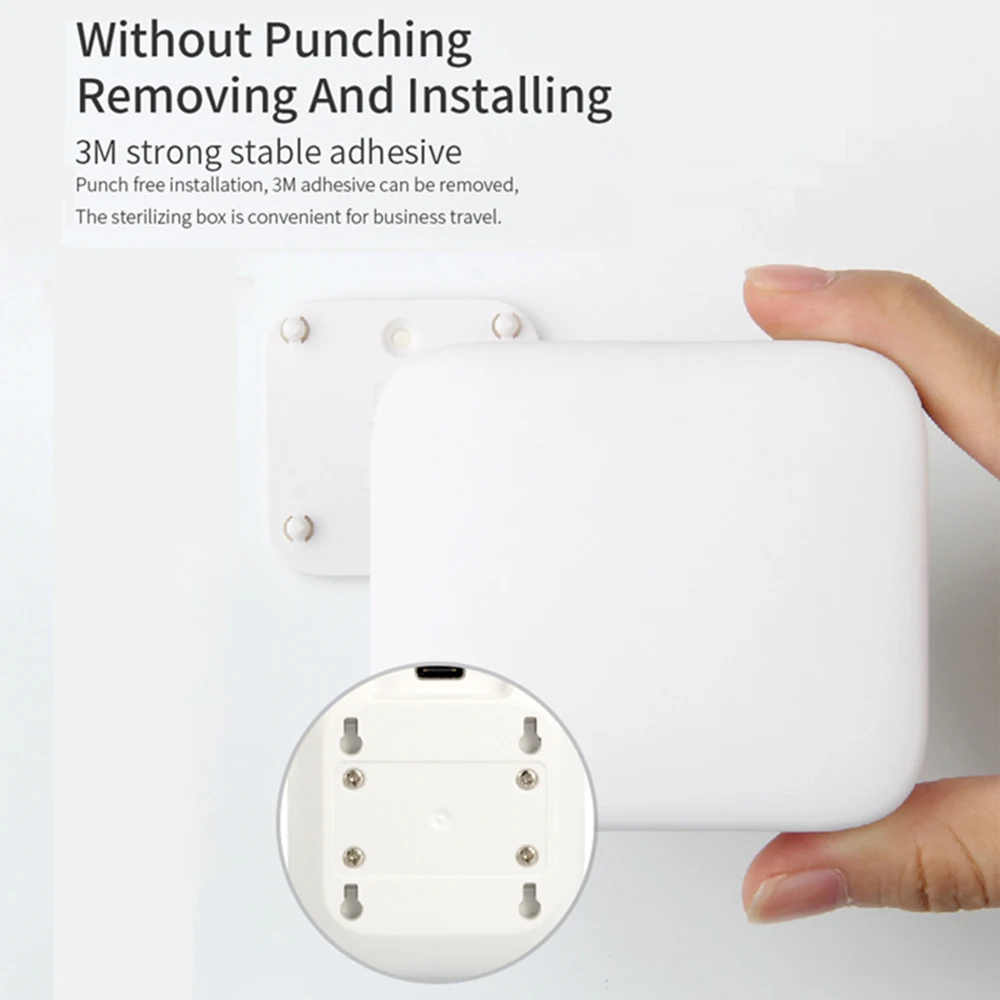 Дезинфектор зубной щетки может быть легко установлен на стене основанием с помощью обратного клея, который также может быть легко отделен для путешествий.
