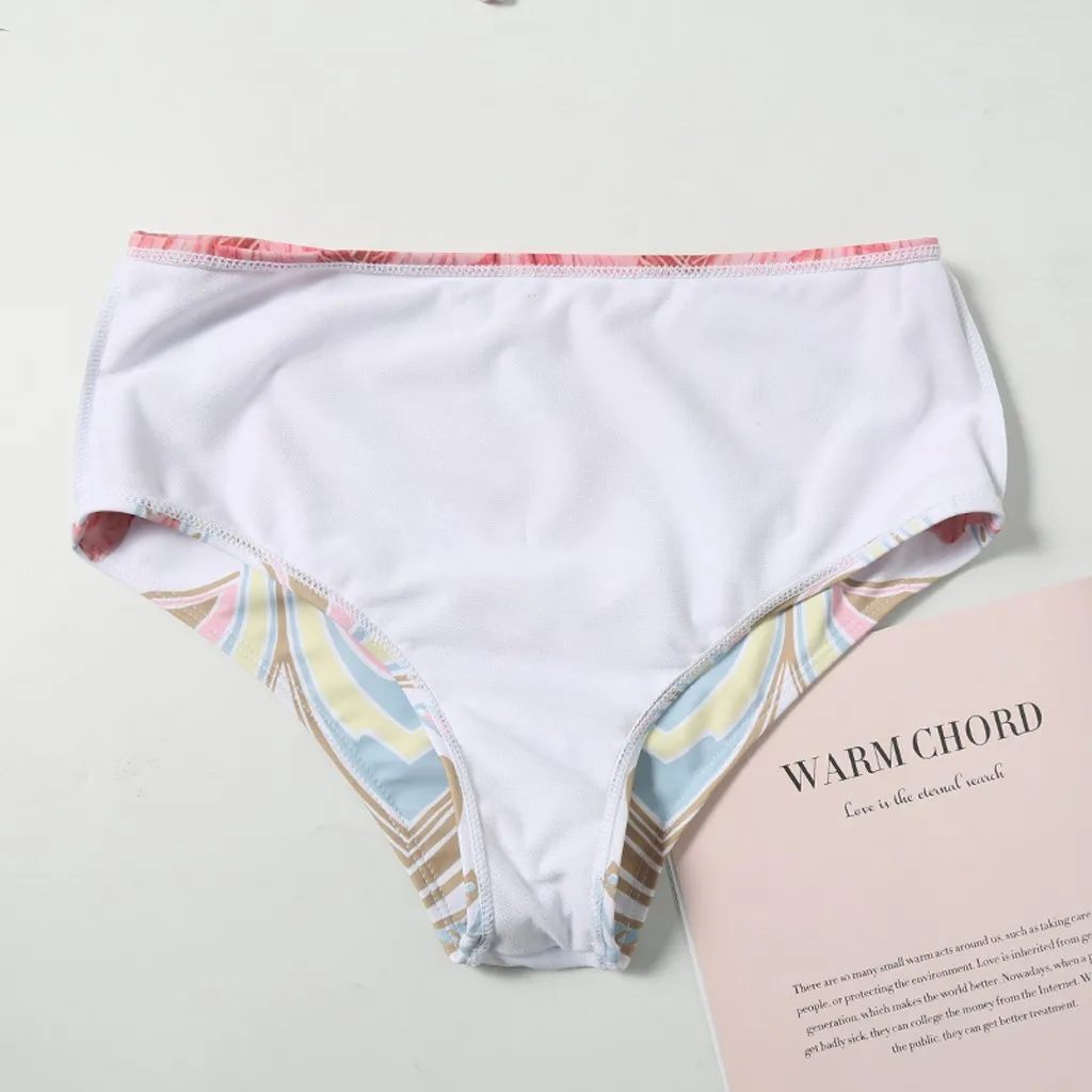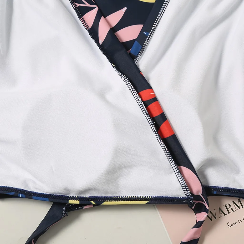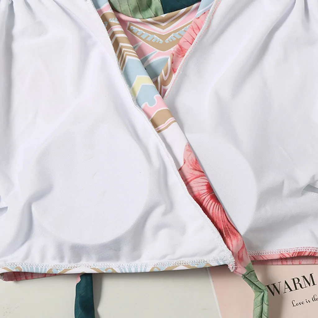 Womens Sexy Deep V Print Short Sleeve Bow Bandage Backless Bikini Split Swimsuit