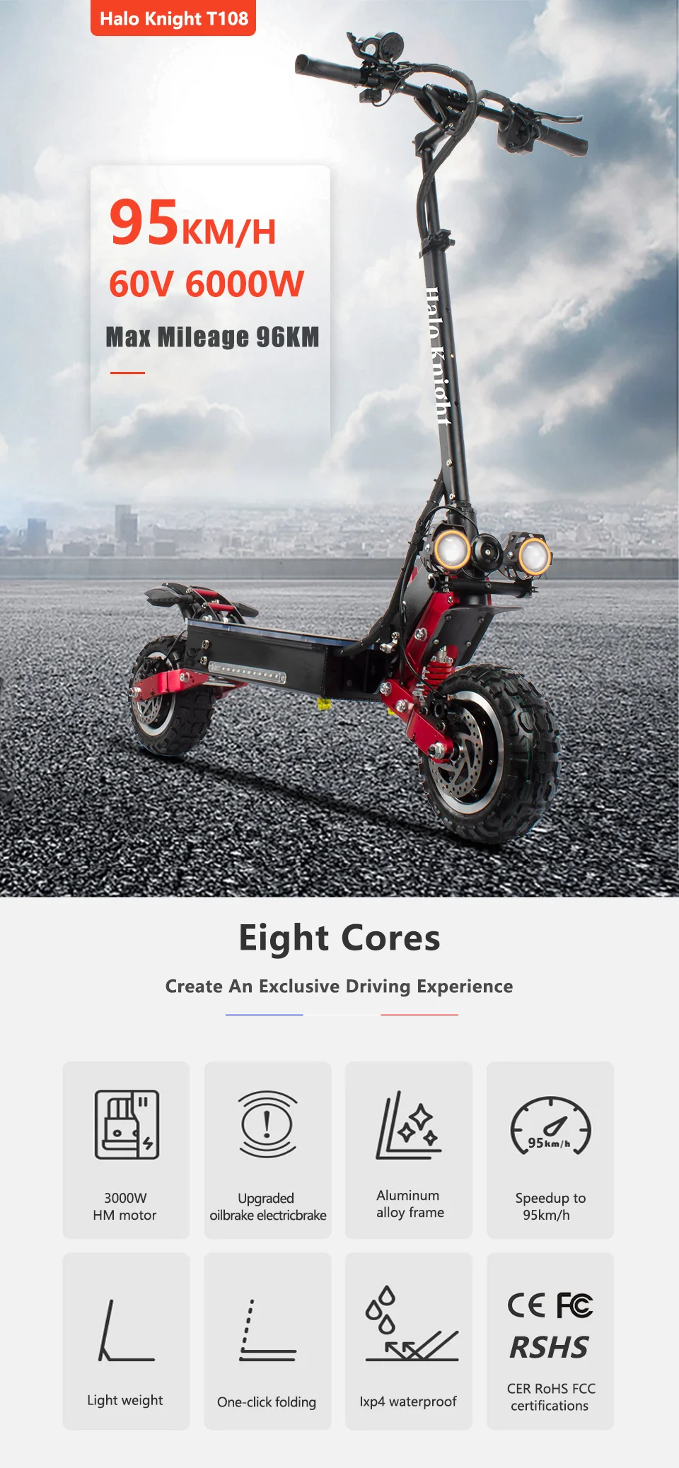 FQA 1. Вопрос: Какой продукт подчеркивает Halo Knight T108? A: T108-это 60 в двойной привод, с мотором HM 60V 3000W (60 мм магнит), контроллером JP 37A, 21700 батареей 28. 8ач/33. 6ач/38,4ач, передняя и задняя амортизация ударов, Угловые глаза, рожок мотоцикла, задний тормозной светильник, боковой светильник s, поворотники, импортированный из Германии бесшаговый руль. 2. В: какой тормоз используется T108? О: передний и задний гидравлический тормоз с EABS. 3. В: какая шина используется T108? О: 11 дюймов CST внедорожные надувные шины. 4. Вопрос: Какова производительность T108? О: скорость может достигать 95 км/ч, работать около 96 км за одну зарядку. 5. Вопрос: Должен ли клиент платить дополнительные налоги или пошлины на скутеры? О: клиентам не нужно платить дополнительные налоги или пошлины, потому что налоги были оплачены на нашей стороне. 6. Вопрос: Сколько времени прибудет скутер? О: если заказ из Китая, займет около 32-42 дней на поезде или по морю. При заказе со склада ЕС, доставка клиентов займет около 3-7 рабочих дней. 7. В: Могу ли я получить все запасные части T108 в магазине? О: Да, мы являемся прямым производителем, все запасные части наших скутеров доступны, даже маленькие винты. 8. В: Могу ли я быть вашим дистрибьютором или могу ли я сделать OEM/ODM, чтобы настроить скутеры с моим логотипом? О: Конечно, мы специализируемся на 8-11 дюймовых скутерах более 8 лет, доступны OEM/ODM, добро пожаловать в один из наших дистрибьюторов. 9. Вопрос: Есть ли гарантия на ваши скутеры? О: Да, гарантия 6 месяцев на батарею, 12 месяцев на другие запасные части. Если скутеры повреждены во время транспортировки или имеют проблемы после прибытия, Бесплатные аксессуары будут отправлены из Китая, и груз будет на стороне продавца. Если запасные части сломаны в течение 12 месяцев или батарея сломана в течение 6 месяцев, Бесплатные аксессуары будут отправлены из Китая, и доставка будет на стороне клиентов. Нанесенный человеком ущерб и вода не покрываются гарантией. Как правило, наши скутеры будут в порядке в течение одного года, потому что будут строгие проверки качества, чтобы убедиться, что каждый скутер идеален перед отправкой. 10. Вопрос: Есть ли сейчас скидка на покупку T108? О: Да, сейчас есть 38% скидок и купонов для T108. Если вы заинтересованы, просто возьмите его.