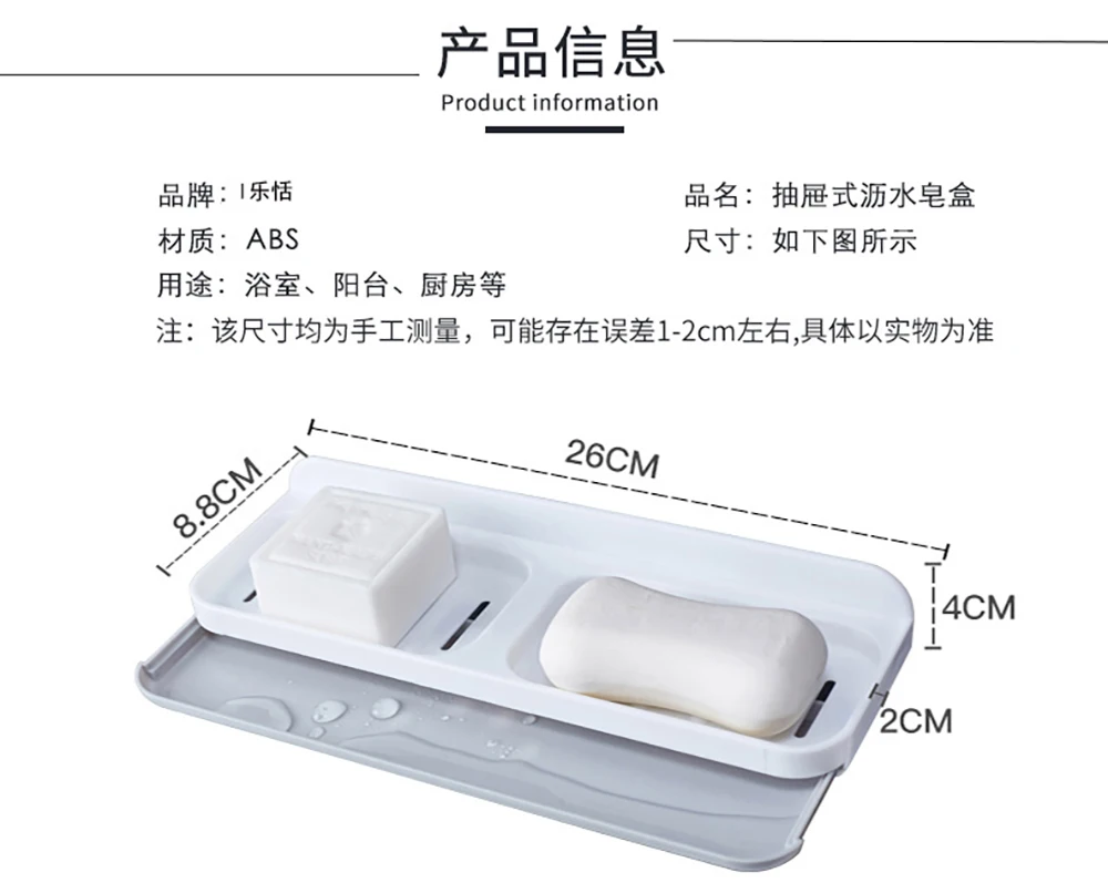 Особенности: Размеры: 26*8,8*2 см Материал: PP PP пластик, прочный и экологически чистый Очень полезный Soapbox для семейного использования Удобный и аккуратный декор для ванной и кухни Простой стиль, модный и благородный. Двухслойный дизайн, более легко сохнет В нижней части выдалбливать, никакая вода Съемный дизайн, универсальный. Посылка включает в себя: 1 шт. контейнер для мыла