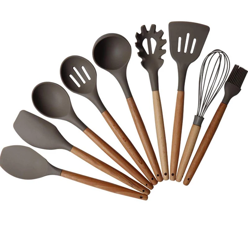 FOOD GRADE SAFE SILICONE -- Made of food-grade silicone, FDA-approved, BPA-free, very safe to use in any type of food. This silicone cooking utensils does not react with food or beverages, or produce any hazardous fumes, you don't have to worry about the health of your families. And it will probably last longer than the other plastic kitchen utensils. NO BEND & NO BREAK & SAFE FOR COOKWARE -- These kitchen utensils are more sturdy than other cheap silicone kitchen utensils, they are firm enough to be able to use the spatulas for flipping and scraping, but soft enough to not scratch your pans. You don't need to worry about the quality being too bendy or breaking, or it'll scratch or damage your cooking pots as metal kitchen utensils do. HEAT-RESISTANT & STAIN-RESISTANT & EASY TO CLEAN -- This kitchen utensil set can withstand very high heat, up to 446°F/230°C. If you're using silicone turners in cooking, you don't have to worry that it will melt when you accidentally leave it in the pot for a while. And it doesn't retain odors or colors when you use it for stirring deep-colored food like tomato-based food products.They are quite easy to clean, we recommend only hand washing, so as not to damage the wooden finish on the handle.