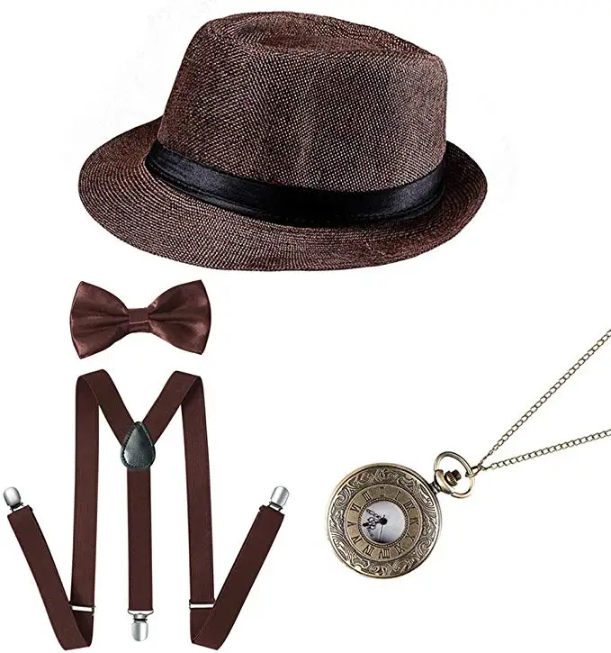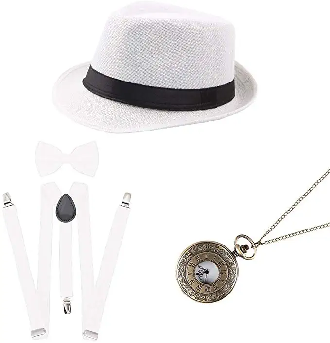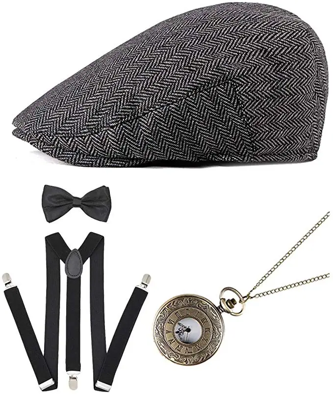 【Roaring 20's Accessories Set】The 1920s accessory set include 1* Men's Light Gray Newsboy Hat, 1* Y-Back Elastic Suspenders, 1* Black Pre Tied Bow Tie, 1* Vintage Pocket Watch. 【Great Gatsby Gangster Costume Accessories】Cute bow tie is made by smooth satin, comfortable and easy to wear. Delicate suspender is made by polyester leather, elastic and durable. Fashion flat cap is adjustable, one size fits most. Vintage pocket watch is made by alloy, beautiful and unique, even can work in daily. 【Fashion Newsboy Hat】The 1920s Gatsby hat is made by soft felt or cotton cloth material, it is fashion and literary, you can wear the newsboy cap at school, home, garden, beach; for work, trip, vacation, it can be a casual dress up hat but also can be a sun protection hat. Suitable young and older, man and woman. 【Perfect for 1920s Theme Party】This vintage accessories set is perfect for prom, event, Christmas and for 1920s party, Great Gatsby party, Gatsby themed party, roaring 20s party. Take you back to historic 1920s. 【Best Gift Choice】This mens costume accessories can be matched with the womens 1920s flapper costume set, let male partner and female partner becoming the main role in the Gatsby Party or other birthday theme party, it is the best gift choice for your boyfriend, husband, father, grandfather and all male friend.
