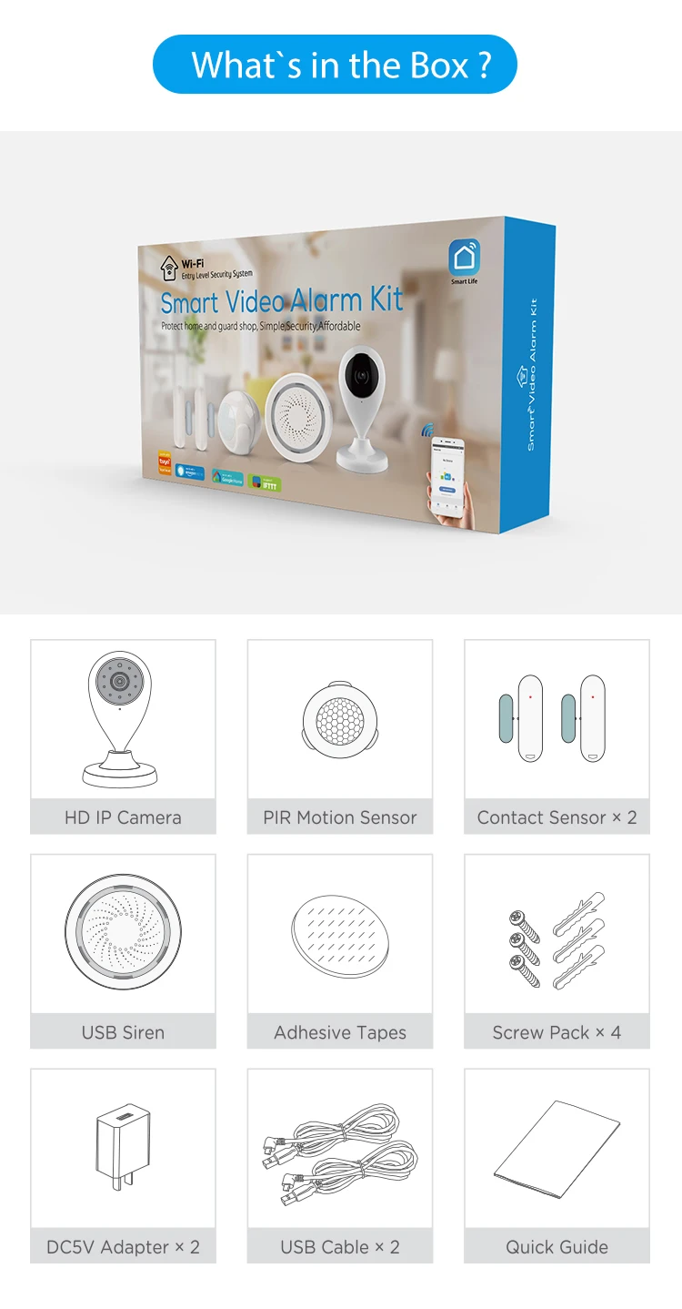 "Простой, безопасный, доступный". Всегда держите того, кого вы любили, то, что вы заботились, в душевном мире! С новым комплектом Exsellance Wi-Fi HD Starter Kit безопасности, мы представляем идеальный набор для его системы безопасности на высоком уровне. Работа с Tuya Smart, Alexa Echo Show, Google Assistant, IFTTT. Особенности (пункт продажи): Без ежемесячно сборы Никаких скрытых расходов и никаких контрактов Легко надевающаяся одежда Комплект сигнализации абсолютно не требует проводки и быстрая и простая Настройка Wi-Fi. Не нужны профессиональные технические навыки. Чрезвычайно простая установка для всех. Уведомления со смартфона Мгновенное в режиме реального времени получение оповещений и уведомлений при срабатывании будильника Пульт дистанционного управления просмотром в режиме реального времени Вы можете проверить удаленный живой просмотр, сигнал тревоги, сигнал тревоги, записанное видео через наше дружественное приложение, как только ваш мобильный телефон Получил срабатывании тревоги уведомления Набор смарт-сценарий сцены Ip-камера Wi-Fi, датчик движения PIR, контактный датчик s может быть настроен в приложении, чтобы установить смарт-сценарные сцены с сиреной Сигналу тревоги при сбое. Как только какие-либо продукты срабатывают, сирена производит мощную 100 дБ сирены, чтобы пугать незваных И снятие с охраны Одна кнопка для установки охраны и снятия с охраны через приложение Smart Life friendly Управление через смартфон Используйте свой смартфон для управления системой безопасности в любое время и в любом месте Расширяемый Комплект безопасности может не только добавить больше датчиков, камер, но также может добавить другие всеTuyaПродукты Wi-Fi-позволяют Настройте свои системы в зависимости от ваших индивидуальных потребностей и требований безопасности. • Простая установка через закрытую ленту