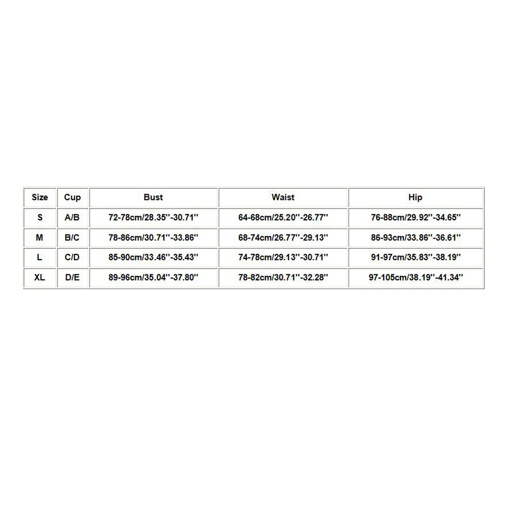 Size Cup Bust Waist Hip S A/B 72-78cm/28.35''-30.71'' 64-68cm/25.20''-26.77'' 76-88cm/29.92''-34.65'' M B/C 78-86cm/30.71''-33.86'' 68-74cm/26.77''-29.13'' 86-93cm/33.86''-36.61'' L C/D 85-90cm/33.46''-35.43'' 74-78cm/29.13''-30.71'' 91-97cm/35.83''-38.19'' XL D/E 89-96cm/35.04''-37.80'' 78-82cm/30.71''-32.28'' 97-105cm/38.19''-41.34''
