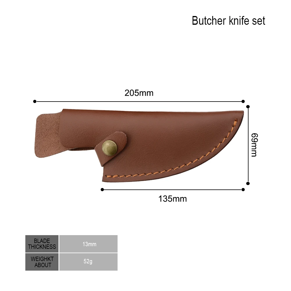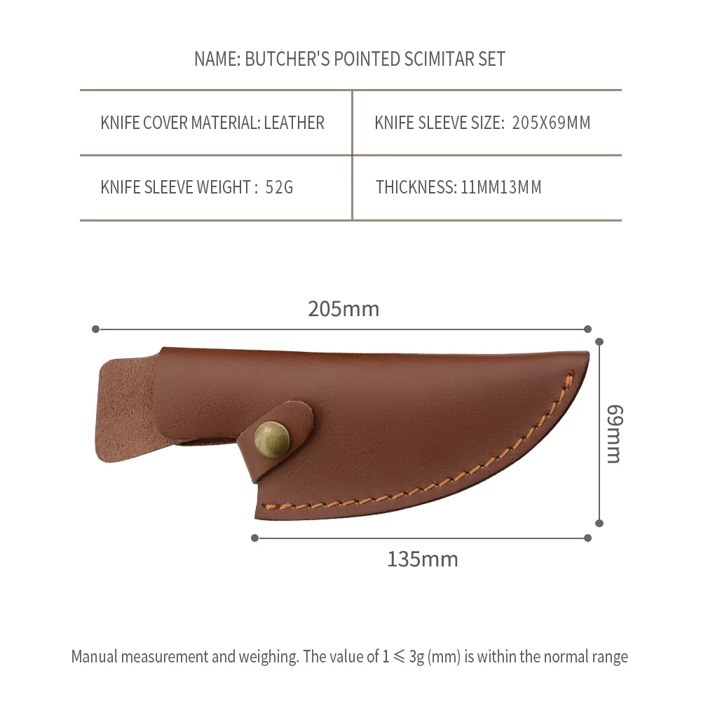 Weight: 52 g Size: 5.5 inch Width: 69 mm Length: 135 mm Blade Thickness : 13 mm Material: High quality leather