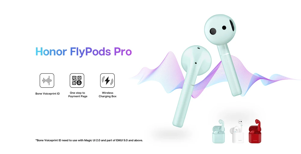 Honor FlyPods Pro творчески помещает датчик Voiceprint в наушники, который может захватывать информацию о голосовой печати пользователя и сочетаться с технологией AI recorgnize для проверки владельца и разблокировки телефона. Это новое время для беспроводных наушников и мобильных телефонов. * Идентификатор Bone Voiceprint должен использоваться с Magic UI 2,0 и частью EMUI 9,0 и выше.