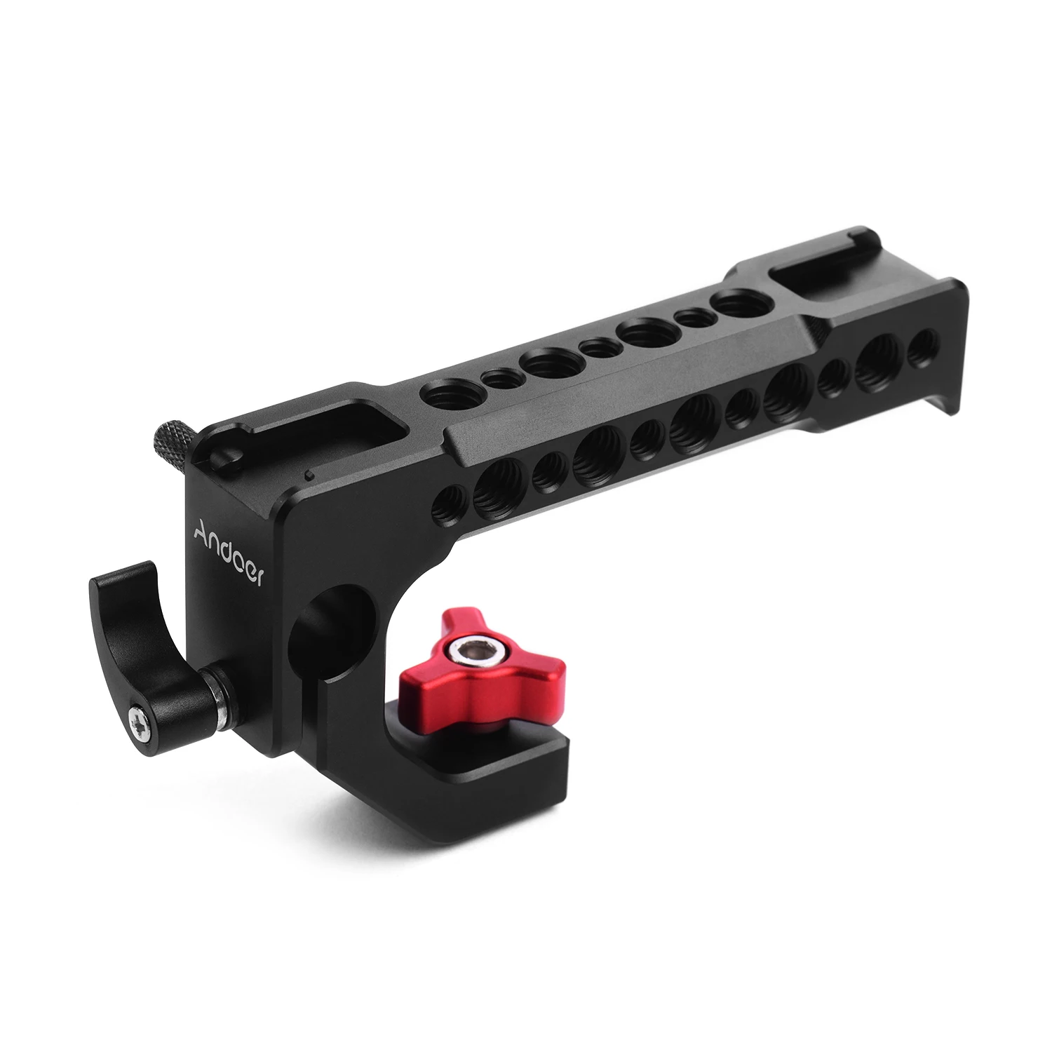 С двойной холодной обувью для крепления микрофона и светодиодный светильник для видеосъемки, один находится сверху, а другой сбоку.