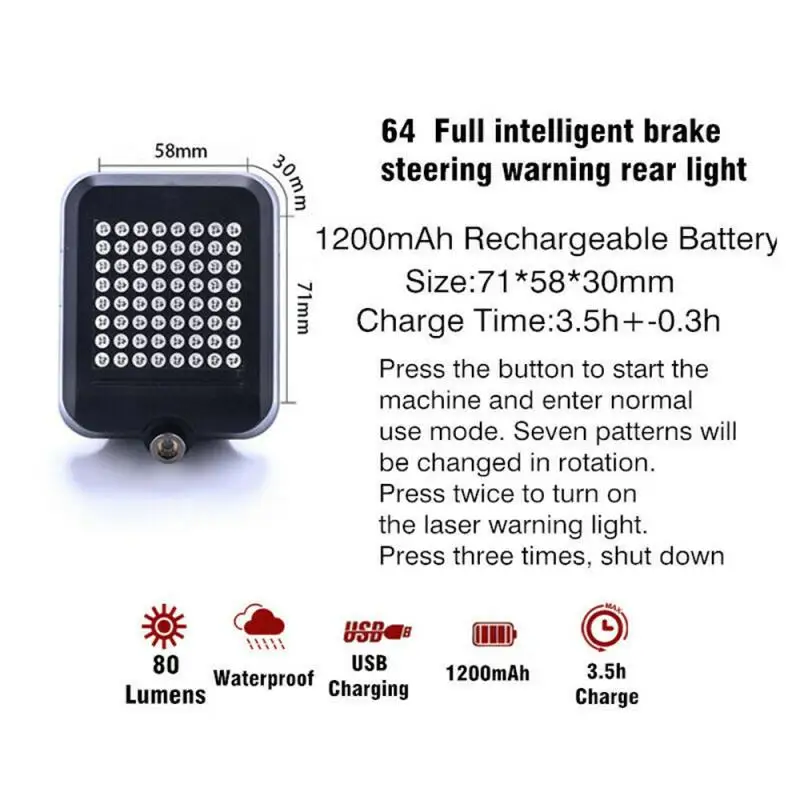 1. Этот задний светильник не нуждается в контроллере, когда велосипед поворачивается налево, светодиодный светильник s автоматически поворачивается на рулевое управление, и светодиодный светильник показывает стрелку, указывающую влево. Когда велосипед поворачивается вправо, светодиодный индикатор покажет стрелку вправо.
