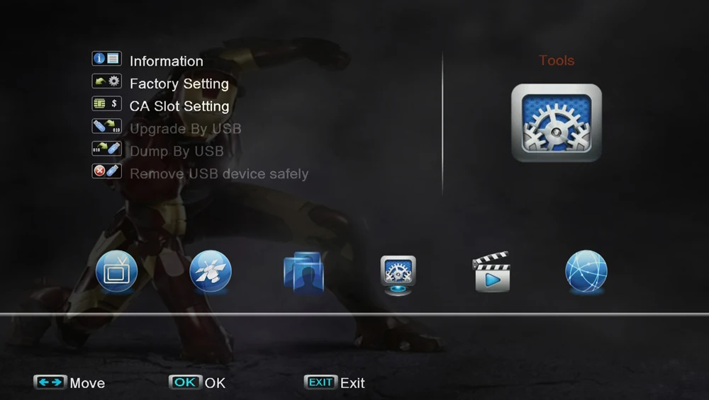 SKYBOX F4S HD PVR имеет простую работу и интерфейс. Спутниковый декодер включает в себя шесть основных интерфейсов, они являются каналами редактирования, установкой, настройкой системы, инструментами, мультимедиа и сетевыми локальными настройками, соответственно.