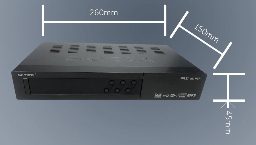 SKYBOX F4S HD PVR имеет размер 260x150x45 мм, металлический чехол, вполне удовлетворительный.