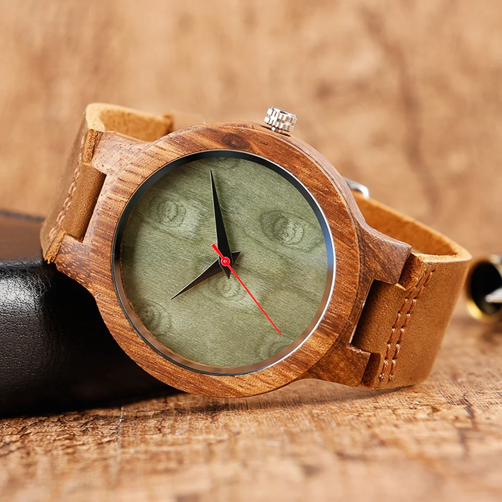 Wooden round case makes this watch unique and stylish.