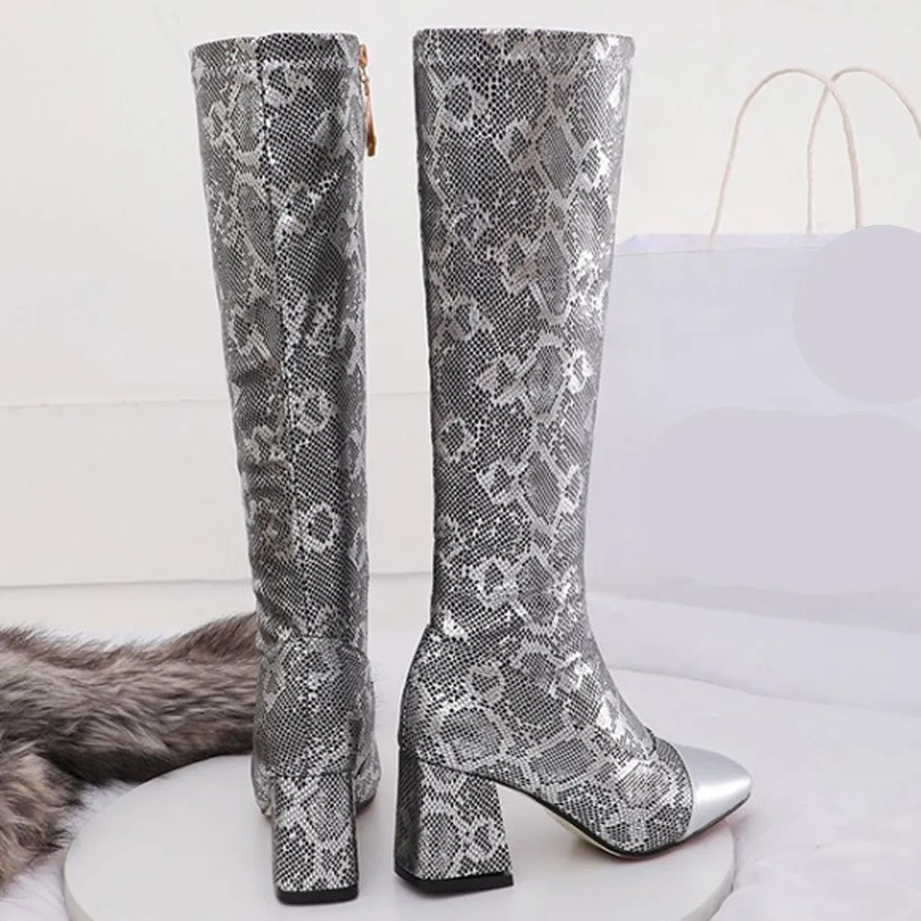 Женские сапоги выше колена на молнии сбоку; высокие сапоги-трубы на высоком квадратном каблуке со змеиным узором