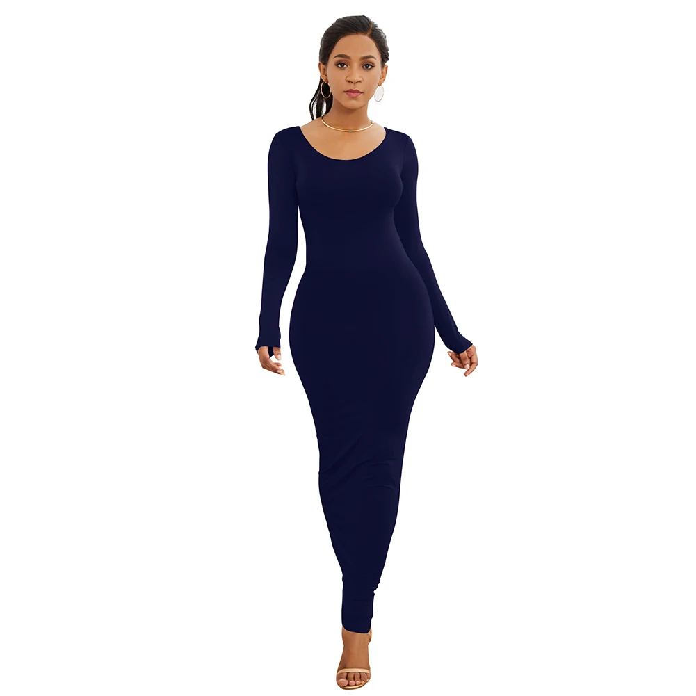 Весенне-осеннее Сексуальное Женское Однотонное Платье макси с длинным рукавом и круглым вырезом
